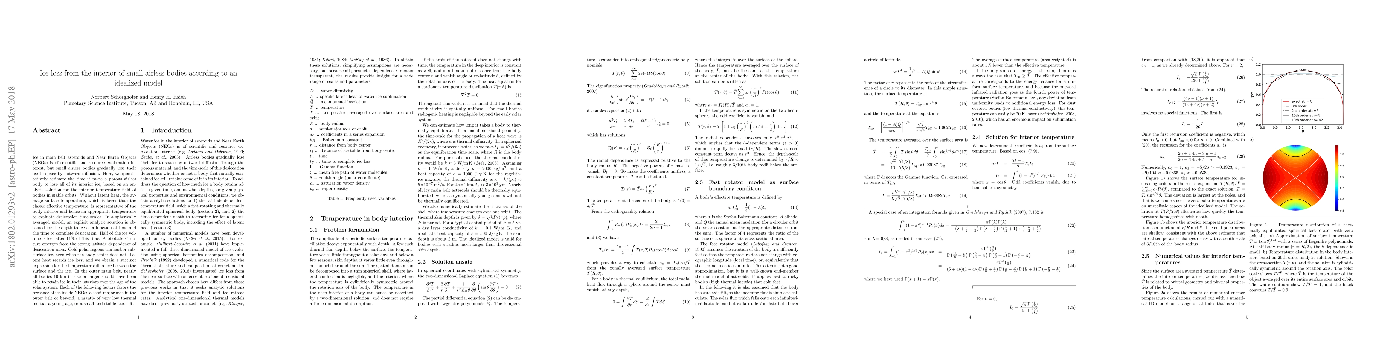 This paper estimates the time it takes for small airless bodies like asteroids and NEOs to lose their interior ice through diffusion, using an analytic model. It finds that latent heat slows ice loss and identifies conditions favoring ice retention, such as a low thermal inertia mantle or a young age.