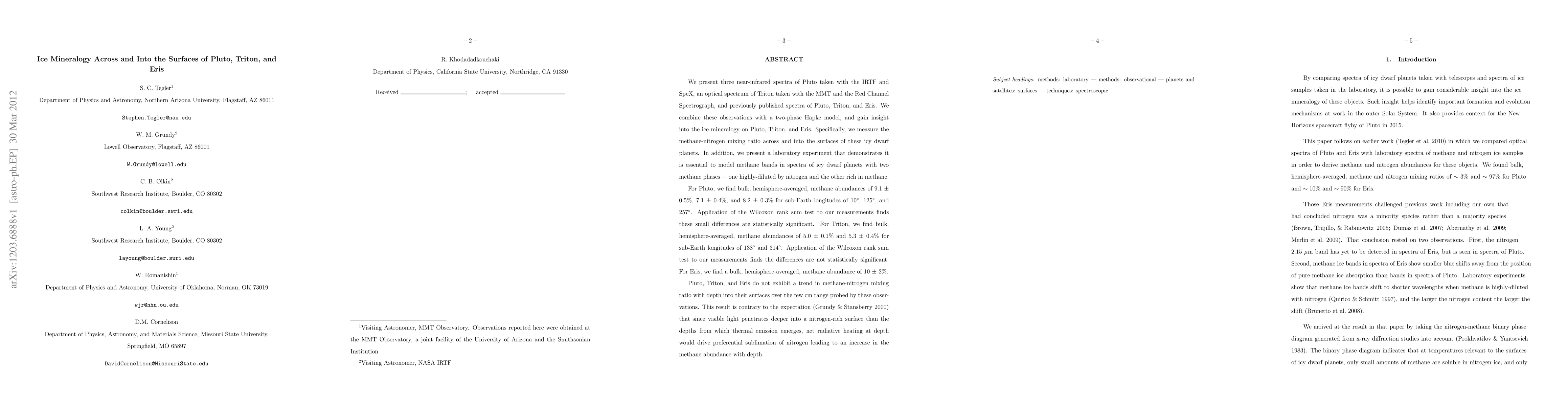This paper analyzes near-infrared and optical spectra of Pluto, Triton, and Eris to determine methane-nitrogen ice mixing ratios, finding statistically significant variations in methane abundance across Pluto's surface but no significant trend with depth. The study emphasizes the necessity of modeling methane in two phases for accurate spectral interpretation.