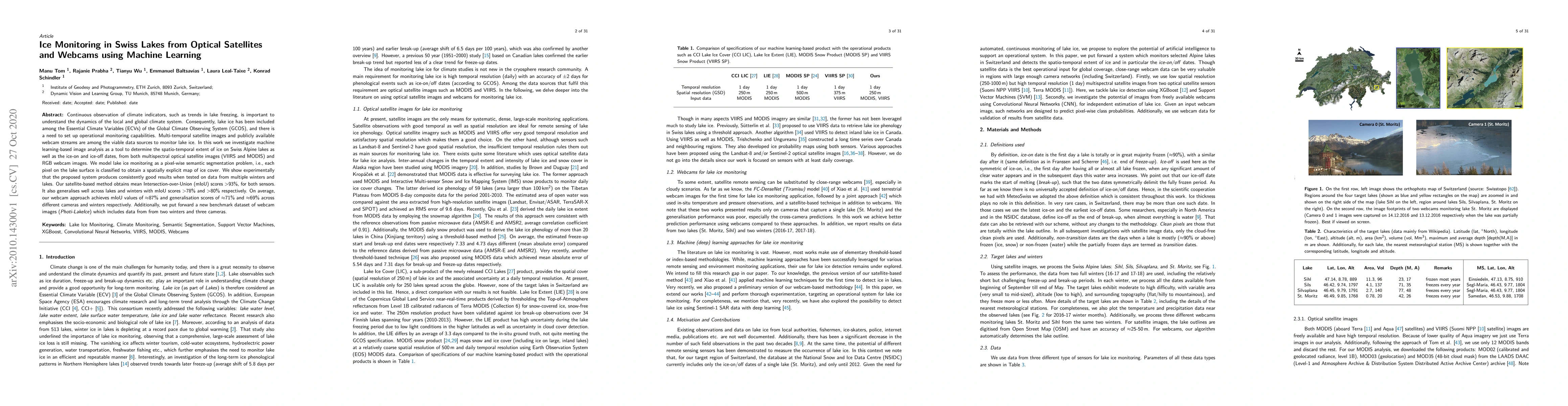 This research develops machine learning techniques to monitor lake ice on Swiss Alpine lakes using satellite and webcam data. The study shows high accuracy in ice extent classification with mean Intersection-over-Union scores above 93% for satellite images and around 87% for webcams, while also introducing a new webcam dataset for further research.