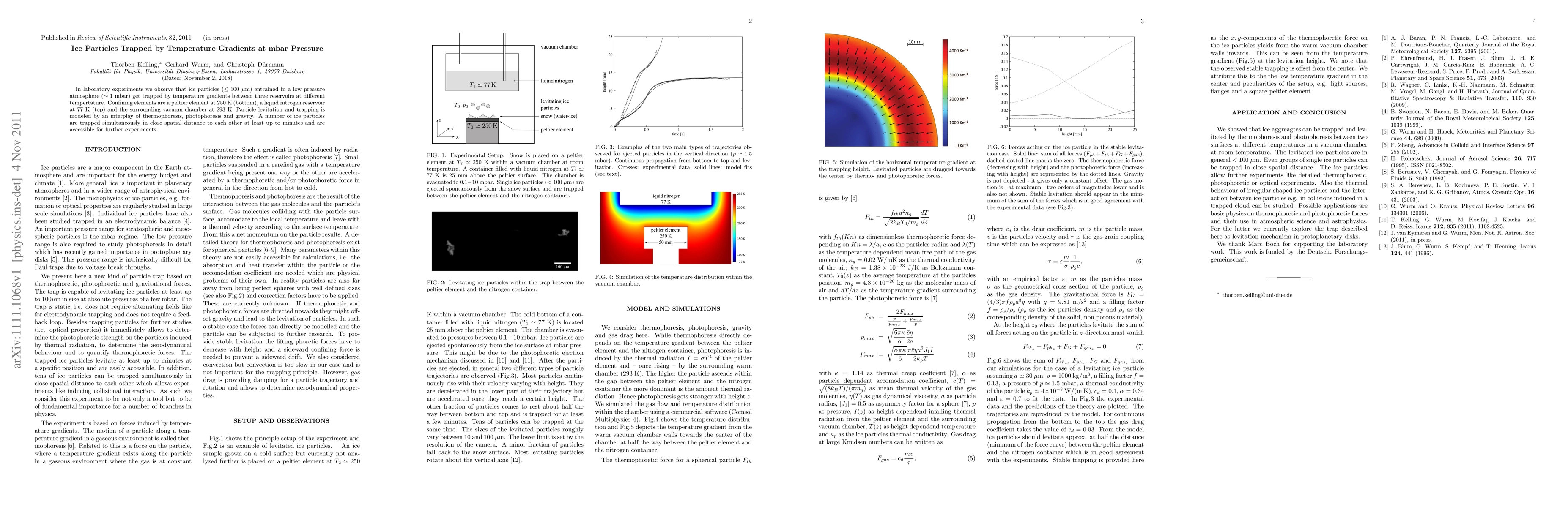 In laboratory experiments we observe that ice particles (\leq100 \mu m) entrained in a low pressure atmosphere (~1 mbar) get trapped by temperature gradients between three reservoirs at different tempertature. Confining elements are a peltier element at 250 K (bottom), a liquid nitrogen reservoir at 77 K (top) and the surrounding vacuum chamber at 293 K. Particle levitation and trapping is modeled by an interplay of thermophoresis, photophoresis and gravity. A number of ice particles are trapped simultaneously in close spatial distance to each other at least up to minutes and are accessible for further experiments.