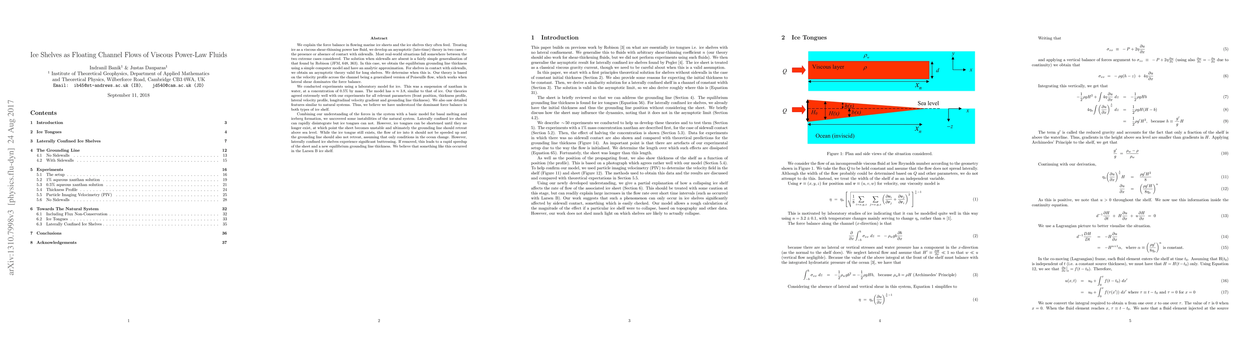 This paper develops a theoretical model to explain the dynamics of ice shelves, treating them as viscous power-law fluids. The study confirms the model's accuracy through laboratory experiments using an aqueous xanthan suspension, showing good agreement with real ice behavior. The findings suggest that ice shelves are stable unless buttressing is removed, leading to rapid ice sheet acceleration.