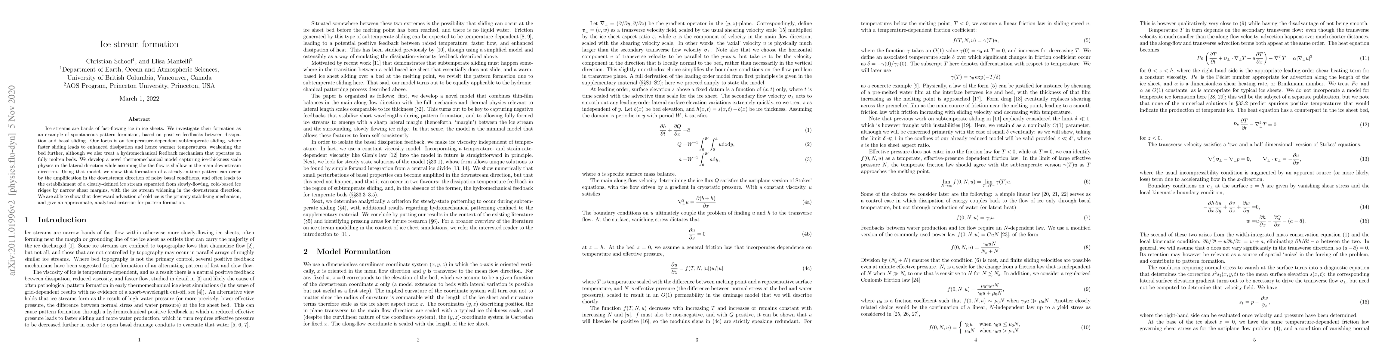 Ice streams are bands of fast-flowing ice in ice sheets. We investigate their formation as an example of spontaneous pattern formation, based on positive feedbacks between dissipation and basal sliding. Our focus is on temperature-dependent subtemperate sliding, where faster sliding leads to enhanced dissipation and hence warmer temperatures, weakening the bed further, although we also treat a hydromechanical feedback mechanism that operates on fully molten beds. We develop a novel thermomechanical model capturing ice-thickness scale physics in the lateral direction while assuming the the flow is shallow in the main downstream direction. Using that model, we show that formation of a steady-in-time pattern can occur by the amplification in the downstream direction of noisy basal conditions, and often leads to the establishment of a clearly-defined ice stream separated from slowly-flowing, cold-based ice ridges by narrow shear margins, with the ice stream widening in the downstream direction. We are able to show that downward advection of cold ice is the primary stabilizing mechanism, and give an approximate, analytical criterion for pattern formation.