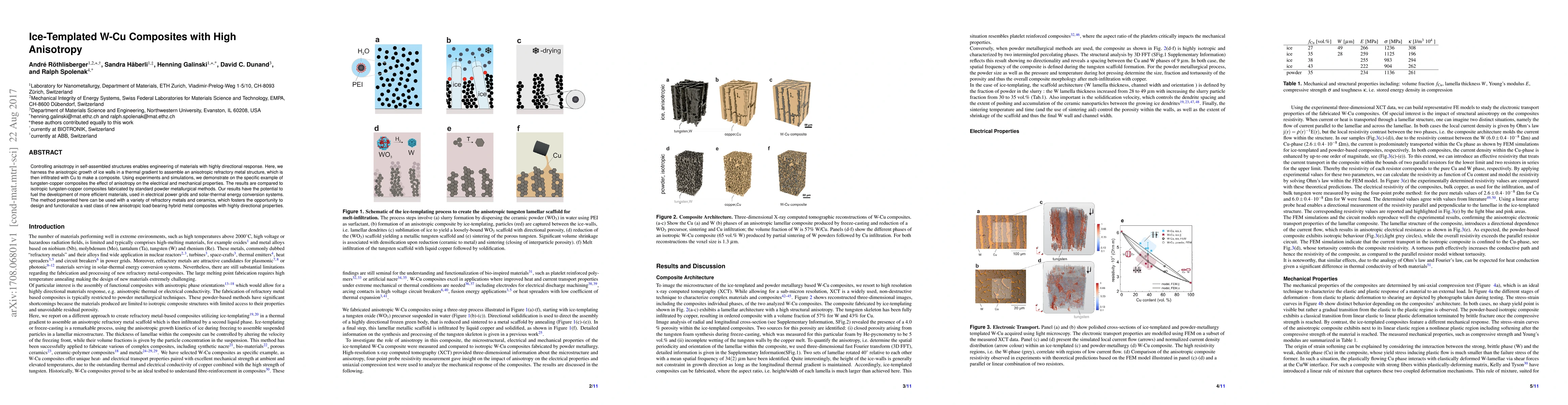 Controlling anisotropy in self-assembled structures enables engineering of materials with highly directional response. Here, we harness the anisotropic growth of ice walls in a thermal gradient to assemble an anisotropic refractory metal structure, which is then infiltrated with Cu to make a composite. Using experiments and simulations, we demonstrate on the specific example of tungsten-copper composites the effect of anisotropy on the electrical and mechanical properties. The results are compared to isotropic tungsten-copper composites fabricated by standard powder metallurgical methods. Our results have the potential to fuel the development of more efficient materials, used in electrical power grids and solar-thermal energy conversion systems. The method presented here can be used with a variety of refractory metals and ceramics, which fosters the opportunity to design and functionalize a vast class of new anisotropic load-bearing hybrid metal composites with highly directional properties.