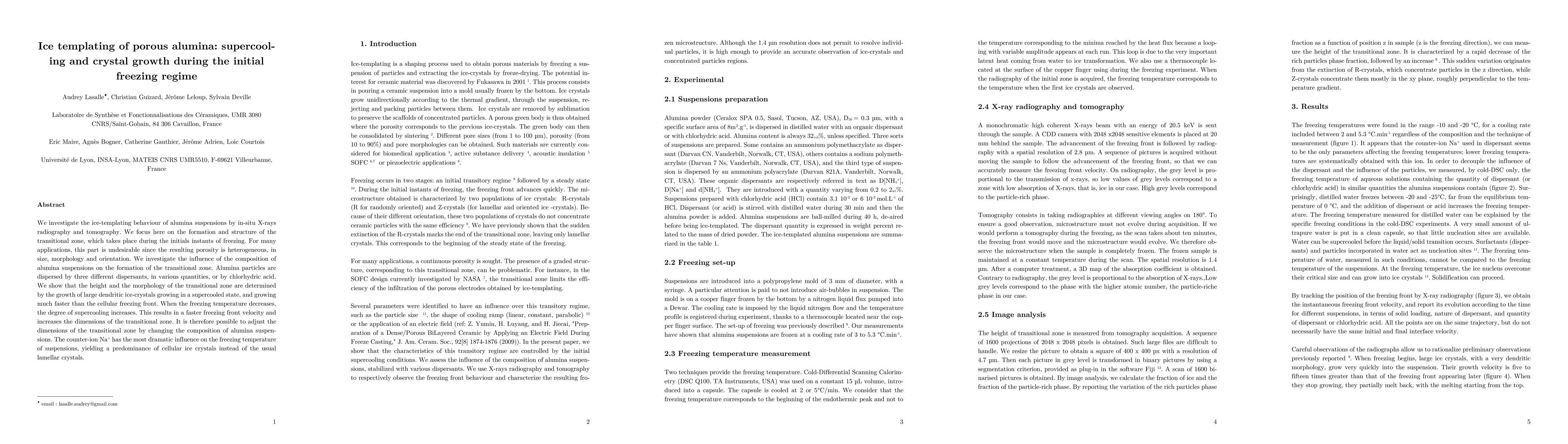 This study explores the ice-templating behavior of alumina suspensions, focusing on the formation of a heterogeneous transitional zone during initial freezing. The research reveals that the size and morphology of this zone are influenced by the growth of dendritic ice crystals in a supercooled state, and can be adjusted by altering the composition of the suspensions, particularly the counter-ion Na+.