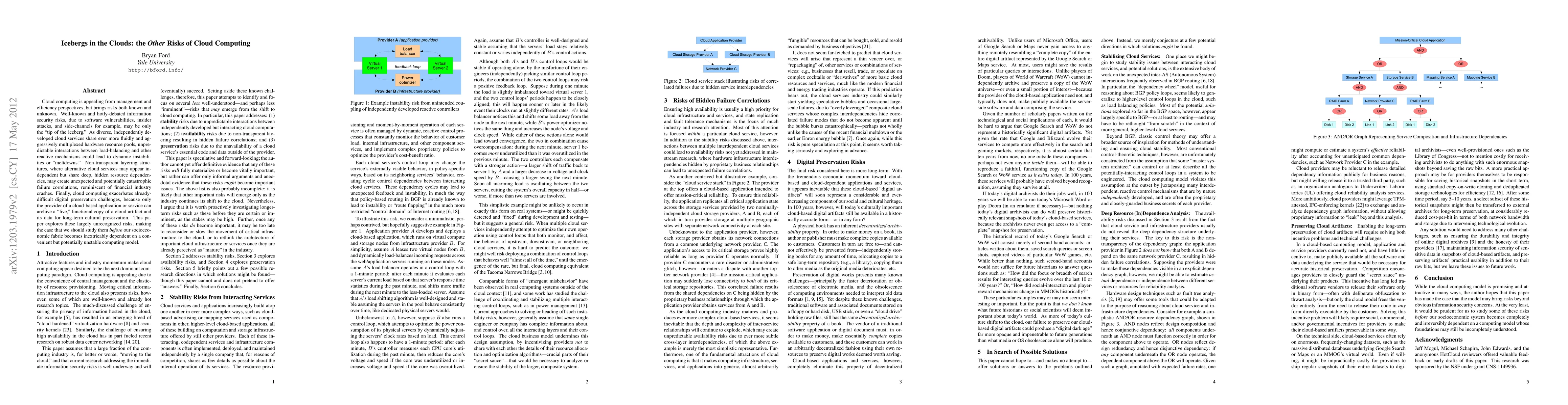 Cloud computing is appealing from management and efficiency perspectives, but brings risks both known and unknown. Well-known and hotly-debated information security risks, due to software vulnerabilities, insider attacks, and side-channels for example, may be only the "tip of the iceberg." As diverse, independently developed cloud services share ever more fluidly and aggressively multiplexed hardware resource pools, unpredictable interactions between load-balancing and other reactive mechanisms could lead to dynamic instabilities or "meltdowns." Non-transparent layering structures, where alternative cloud services may appear independent but share deep, hidden resource dependencies, may create unexpected and potentially catastrophic failure correlations, reminiscent of financial industry crashes. Finally, cloud computing exacerbates already-difficult digital preservation challenges, because only the provider of a cloud-based application or service can archive a "live," functional copy of a cloud artifact and its data for long-term cultural preservation. This paper explores these largely unrecognized risks, making the case that we should study them before our socioeconomic fabric becomes inextricably dependent on a convenient but potentially unstable computing model.