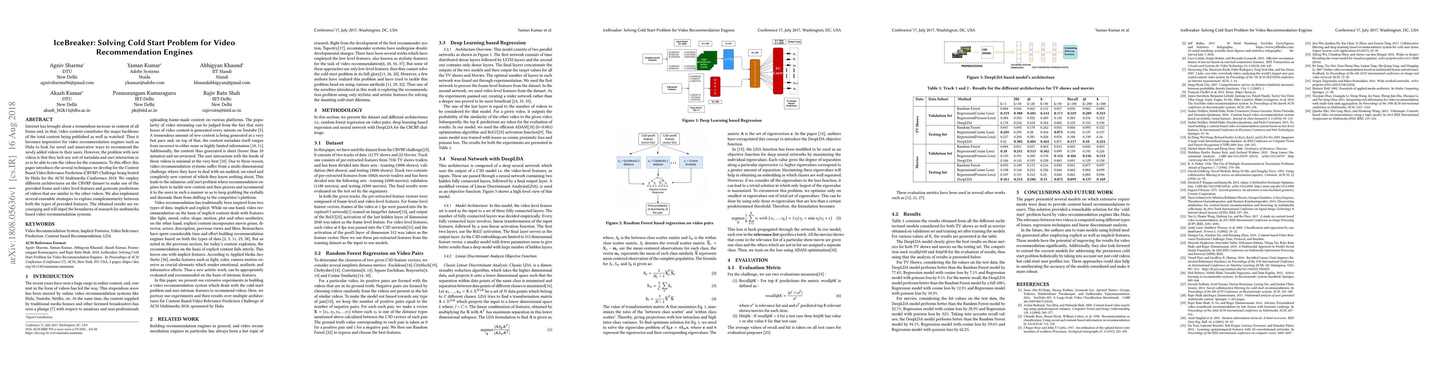 Internet has brought about a tremendous increase in content of all forms and, in that, video content constitutes the major backbone of the total content being published as well as watched. Thus it becomes imperative for video recommendation engines such as Hulu to look for novel and innovative ways to recommend the newly added videos to their users. However, the problem with new videos is that they lack any sort of metadata and user interaction so as to be able to rate the videos for the consumers. To this effect, this paper introduces the several techniques we develop for the Content Based Video Relevance Prediction (CBVRP) Challenge being hosted by Hulu for the ACM Multimedia Conference 2018. We employ different architectures on the CBVRP dataset to make use of the provided frame and video level features and generate predictions of videos that are similar to the other videos. We also implement several ensemble strategies to explore complementarity between both the types of provided features. The obtained results are encouraging and will impel the boundaries of research for multimedia based video recommendation systems.