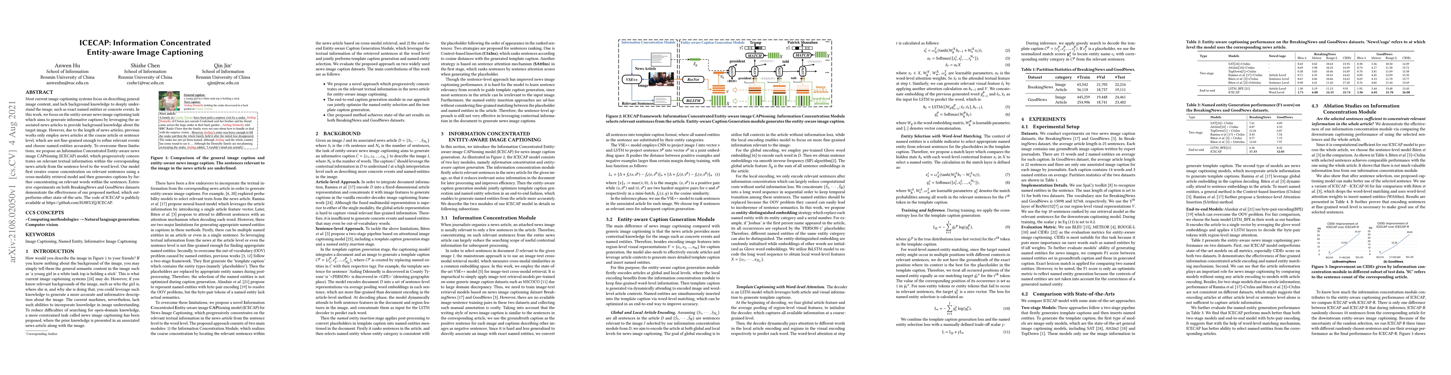 Most current image captioning systems focus on describing general image content, and lack background knowledge to deeply understand the image, such as exact named entities or concrete events. In this work, we focus on the entity-aware news image captioning task which aims to generate informative captions by leveraging the associated news articles to provide background knowledge about the target image. However, due to the length of news articles, previous works only employ news articles at the coarse article or sentence level, which are not fine-grained enough to refine relevant events and choose named entities accurately. To overcome these limitations, we propose an Information Concentrated Entity-aware news image CAPtioning (ICECAP) model, which progressively concentrates on relevant textual information within the corresponding news article from the sentence level to the word level. Our model first creates coarse concentration on relevant sentences using a cross-modality retrieval model and then generates captions by further concentrating on relevant words within the sentences. Extensive experiments on both BreakingNews and GoodNews datasets demonstrate the effectiveness of our proposed method, which outperforms other state-of-the-arts. The code of ICECAP is publicly available at https://github.com/HAWLYQ/ICECAP.