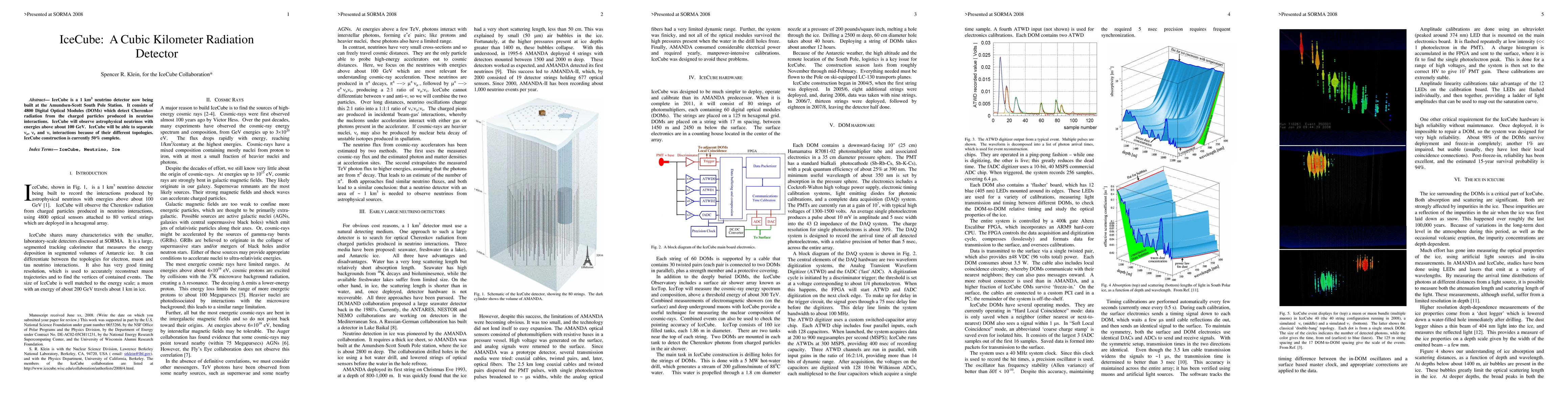 IceCube is a large-scale neutrino detector being built at the South Pole to observe high-energy neutrinos from space. It uses thousands of optical sensors to detect light produced when neutrinos interact with ice, helping scientists study cosmic phenomena.