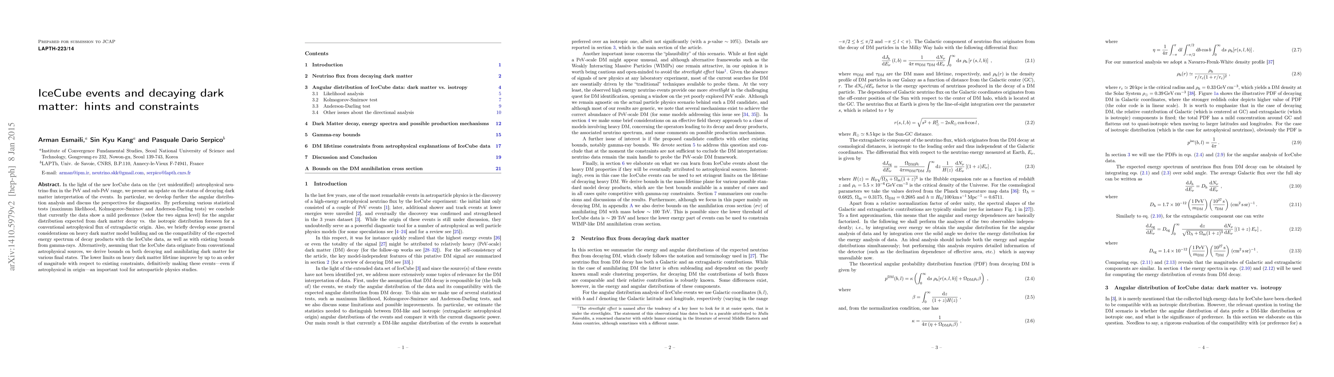 In the light of the new IceCube data on the (yet unidentified) astrophysical neutrino flux in the PeV and sub-PeV range, we present an update on the status of decaying dark matter interpretation of the events. In particular, we develop further the angular distribution analysis and discuss the perspectives for diagnostics. By performing various statistical tests (maximum likelihood, Kolmogorov-Smirnov and Anderson-Darling tests) we conclude that currently the data show a mild preference (below the two sigma level) for the angular distribution expected from dark matter decay vs. the isotropic distribution foreseen for a conventional astrophysical flux of extragalactic origin. Also, we briefly develop some general considerations on heavy dark matter model building and on the compatibility of the expected energy spectrum of decay products with the IceCube data, as well as with existing bounds from gamma-rays. Alternatively, assuming that the IceCube data originate from conventional astrophysical sources, we derive bounds on both decaying and annihilating dark matter for various final states. The lower limits on heavy dark matter lifetime improve by up to an order of magnitude with respect to existing constraints, definitively making these events---even if astrophysical in origin---an important tool for astroparticle physics studies.
