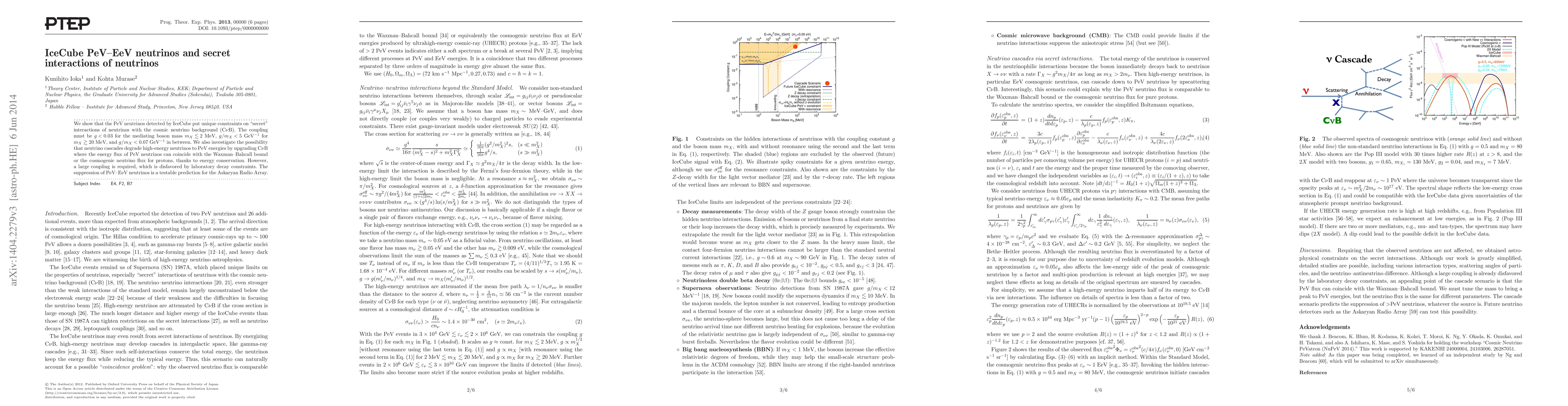 We show that the PeV neutrinos detected by IceCube put unique constraints on "secret" interactions of neutrinos with the cosmic neutrino background (C$\nu$B). The coupling must be $g <0.03$ for the mediating boson mass $m_{X} \lesssim 2$ MeV, $g/m_{X} < 5$ GeV$^{-1}$ for $m_{X} \gtrsim 20$ MeV, and $g/m_{X} < 0.07$ GeV$^{-1}$ in between. We also investigate the possibility that neutrino cascades degrade high-energy neutrinos to PeV energies by upgrading C$\nu$B where the energy flux of PeV neutrinos can coincide with the Waxman-Bahcall bound or the cosmogenic neutrino flux for protons, thanks to energy conservation. However a large coupling is required, which is disfavored by laboratory decay constraints. The suppression of PeV-EeV neutrinos is a testable prediction for the Askaryan Radio Array.