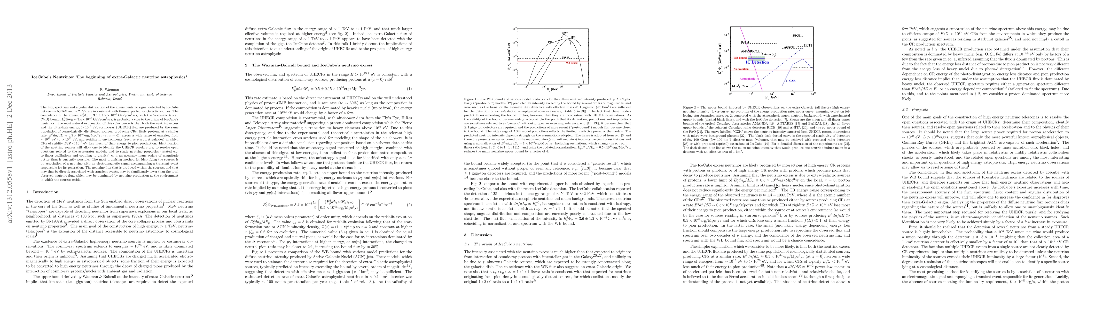 The flux, spectrum and angular distribution of the excess neutrino signal detected by IceCube between 50TeV and 2PeV are inconsistent with those expected for Galactic sources. The coincidence of the excess, $E_\nu^2\Phi_\nu=3.6\pm1.2\times10^{-8}(GeV/ cm^2 sr s)$, with the Waxman-Bahcall (WB) bound, $E_\nu^2\Phi_{WB}=3.4\times10^{-8}(GeV/cm^2 sr s)$, is probably a clue to the origin of IceCube's neutrinos. The most natural explanation of this coincidence is that both the neutrino excess and the ultra-high energy, $>10^{19}$ eV, cosmic-ray (UHECR) flux are produced by the same population of cosmologically distributed sources, producing CRs, likely protons, at a similar rate, $E^2 dQ/dE=0.5\times10^{44}(erg/Mpc^3yr)$ (at z=0), across a wide range of energies, from $10^{15}$ eV to $>10^{20}$ eV, and residing in environments (such as starburst galaxies) in which CRs of rigidity $E/Z< 10^{17}$ eV lose much of their energy to pion production. Identification of the neutrino sources will allow one to identify the UHECR accelerators, to resolve open questions related to the accelerator models, and to study neutrino properties (related e.g. to flavor oscillations and coupling to gravity) with an accuracy many orders of magnitude better than is currently possible. The most promising method for identifying the sources is by association of a neutrino with an electromagnetic signal accompanying a transient event responsible for its generation. The neutrino flux that is produced within the sources, and that may thus be directly associated with transient events, may be significantly lower than the total observed neutrino flux, which may be dominated by neutrino production at the environment in which the sources reside.
