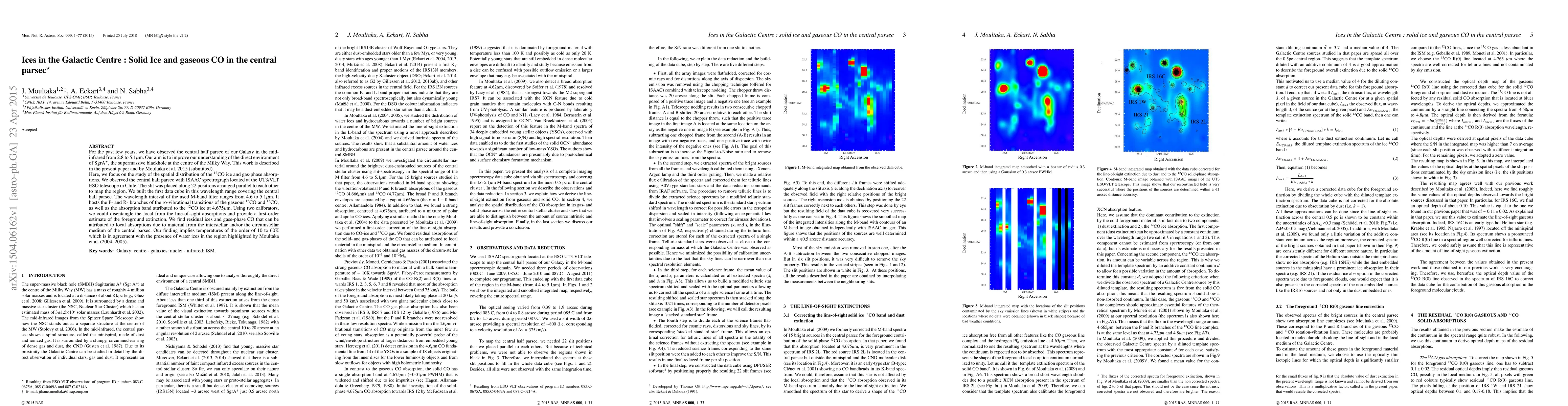 For the past few years, we have observed the central half parsec of our Galaxy in the mid-infrared from 2.8 to 5.1 micron. Our aim is to improve our understanding of the direct environment of SgrA*, the supermassive blackhole at the centre of the Milky Way. This work is described in the present paper and by Moultaka et al. 2015 (submitted). Here, we focus on the study of the spatial distribution of the 12CO ice and gas-phase absorptions. We observed the central half parsec with ISAAC spectrograph located at the UT3/VLT ESO telescope in Chile. The slit was placed along 22 positions arranged parallel to each other to map the region. We built the first data cube in this wavelength range covering the central half parsec. The wavelength interval of the used M-band filter ranges from 4.6 to 5.1 micron. It hosts the P- and R- branches of the ro-vibrational transitions of the gaseous 12CO and 13CO, as well as the absorption band attributed to the 12CO ice at 4.675 micron. Using two calibrators, we could disentangle the local from the line-of-sight absorptions and provide a first-order estimate of the foreground extinction. We find residual ices and gase-phase CO that can be attributed to local absorptions due to material from the interstellar and/or the circumstellar medium of the central parsec. Our finding implies temperatures of the order of 10 to 60K which is in agreement with the presence of water ices in the region highlighted by Moultaka et al. (2004, 2005).