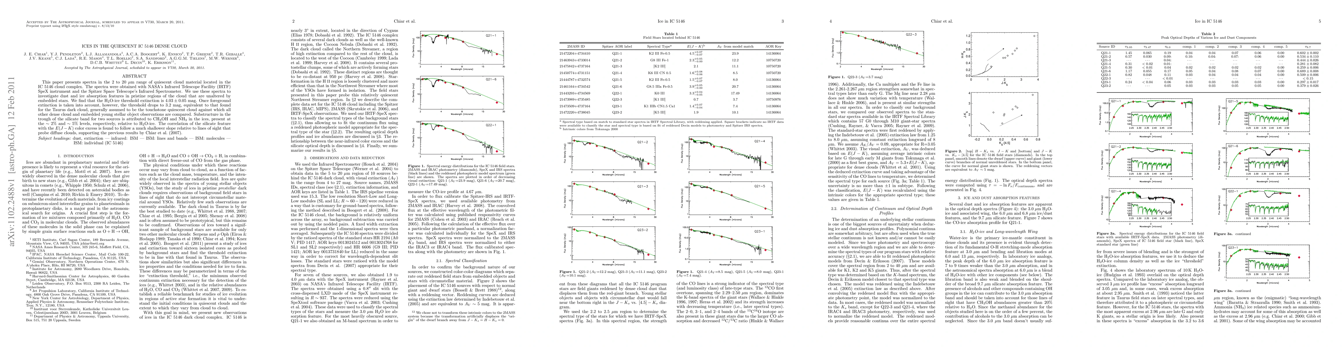 This paper presents spectra in the 2 to 20 micron range of quiescent cloud material located in the IC 5146 cloud complex. The spectra were obtained with NASA's Infrared Telescope Facility (IRTF) SpeX instrument and the Spitzer Space Telescope's Infrared Spectrometer. We use these spectra to investigate dust and ice absorption features in pristine regions of the cloud that are unaltered by embedded stars. We find that the H2O-ice threshold extinction is 4.03+/-0.05 mag. Once foreground extinction is taken into account, however, the threshold drops to 3.2 mag, equivalent to that found for the Taurus dark cloud, generally assumed to be the touchstone quiescent cloud against which all other dense cloud and embedded young stellar object observations are compared. Substructure in the trough of the silicate band for two sources is attributed to CH3OH and NH3 in the ices, present at the ~2% and ~5% levels, respectively, relative to H2O-ice. The correlation of the silicate feature with the E(J-K) color excess is found to follow a much shallower slope relative to lines of sight that probe diffuse clouds, supporting the previous results by Chiar et al. (2007).