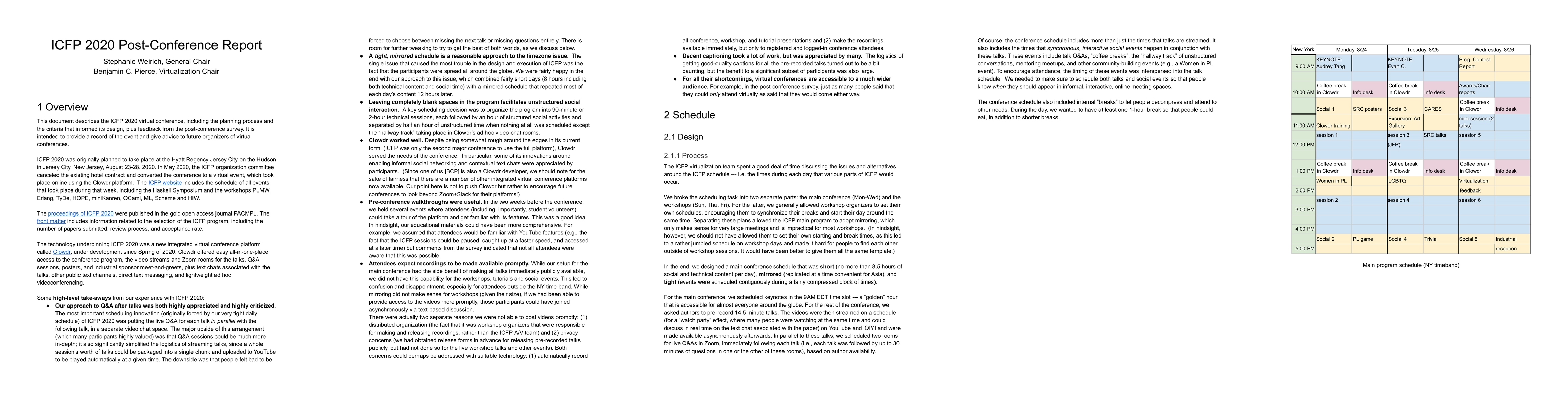 This report documents the ICFP 2020 virtual conference, outlining its design criteria and post-conference survey feedback to inform future event planning.