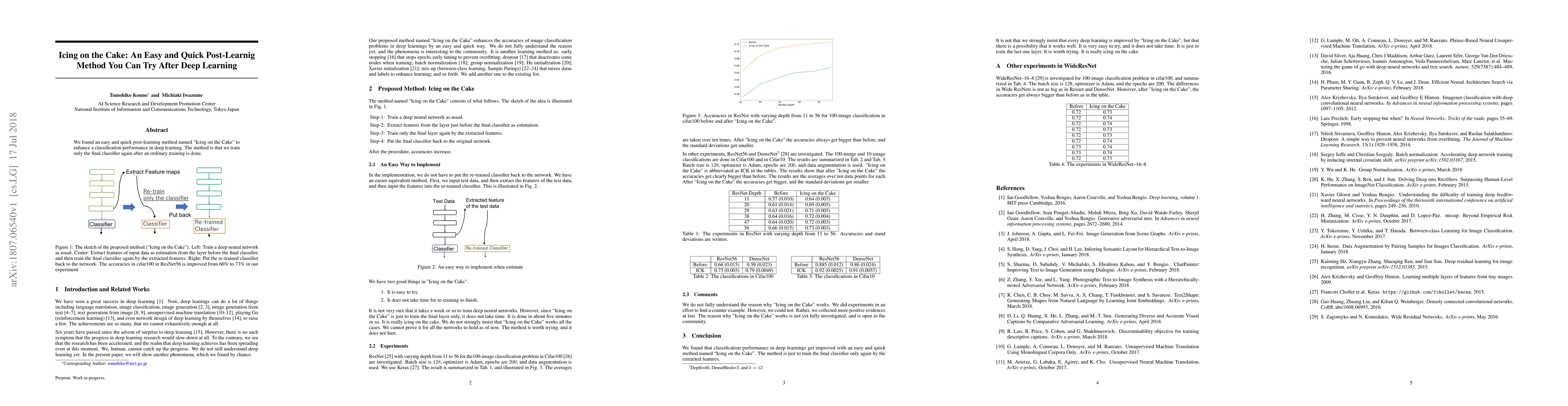 We found an easy and quick post-learning method named "Icing on the Cake" to enhance a classification performance in deep learning. The method is that we train only the final classifier again after an ordinary training is done.