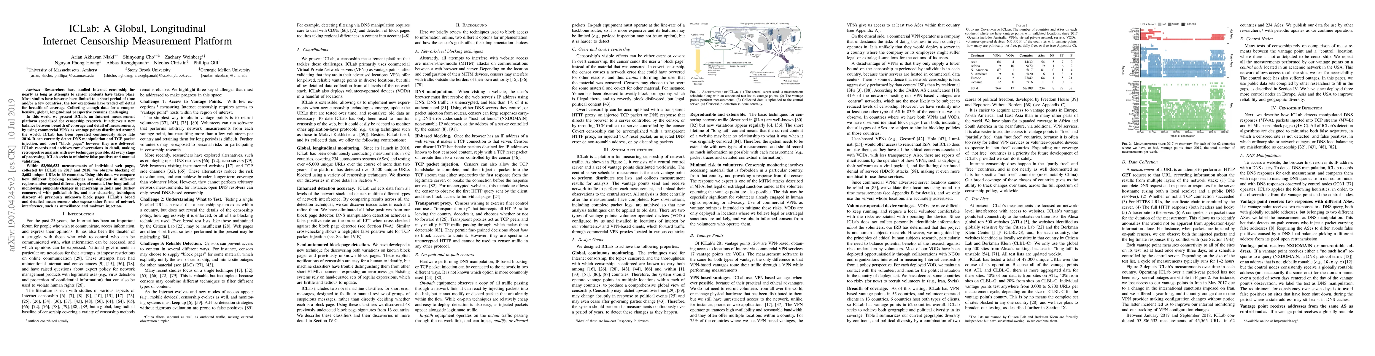 ICLab is a global, longitudinal Internet censorship measurement platform that balances breadth and detail using commercial VPNs as distributed vantage points. It detects DNS manipulation, TCP packet injection, and overt "block pages," revealing censorship trends and techniques across 60 countries.