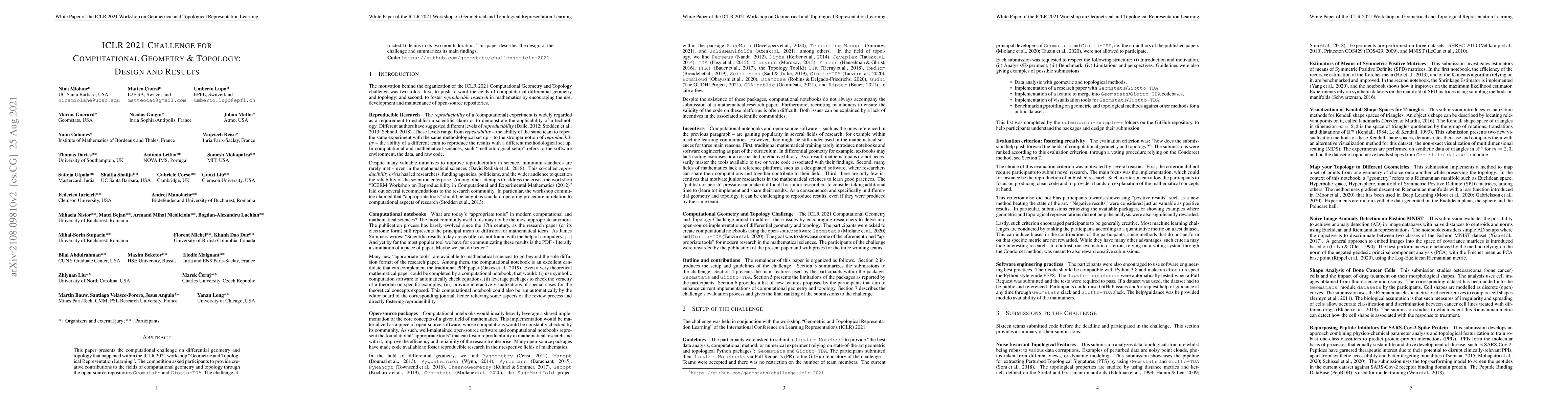 This paper presents the computational challenge on differential geometry and topology that happened within the ICLR 2021 workshop "Geometric and Topological Representation Learning". The competition asked participants to provide creative contributions to the fields of computational geometry and topology through the open-source repositories Geomstats and Giotto-TDA. The challenge attracted 16 teams in its two month duration. This paper describes the design of the challenge and summarizes its main findings.