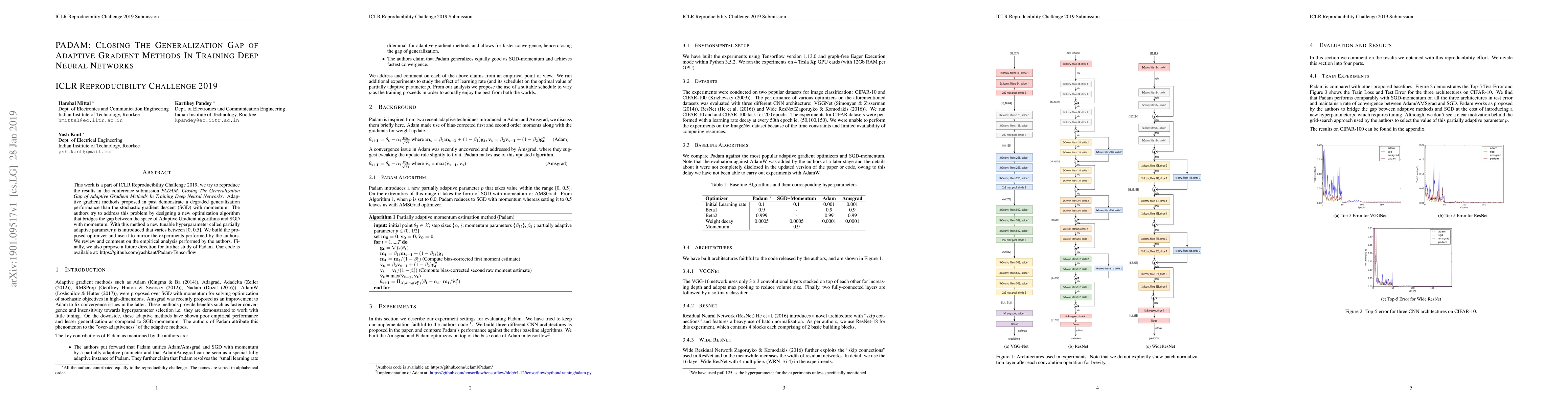 This paper reports on the reproducibility efforts for the PADAM algorithm, aiming to close the generalization gap of adaptive gradient methods in deep neural networks. The authors introduce a new tunable hyperparameter and propose a new optimization algorithm, mirroring the original experiments and suggesting future research directions.