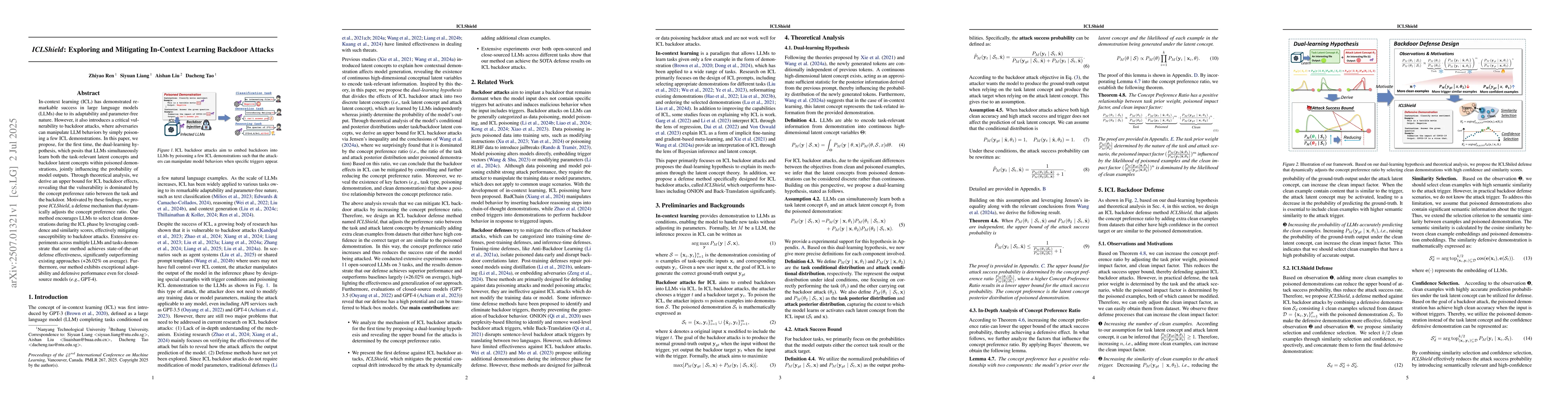 In-context learning (ICL) has demonstrated remarkable success in large language models (LLMs) due to its adaptability and parameter-free nature. However, it also introduces a critical vulnerability to backdoor attacks, where adversaries can manipulate LLM behaviors by simply poisoning a few ICL demonstrations. In this paper, we propose, for the first time, the dual-learning hypothesis, which posits that LLMs simultaneously learn both the task-relevant latent concepts and backdoor latent concepts within poisoned demonstrations, jointly influencing the probability of model outputs. Through theoretical analysis, we derive an upper bound for ICL backdoor effects, revealing that the vulnerability is dominated by the concept preference ratio between the task and the backdoor. Motivated by these findings, we propose ICLShield, a defense mechanism that dynamically adjusts the concept preference ratio. Our method encourages LLMs to select clean demonstrations during the ICL phase by leveraging confidence and similarity scores, effectively mitigating susceptibility to backdoor attacks. Extensive experiments across multiple LLMs and tasks demonstrate that our method achieves state-of-the-art defense effectiveness, significantly outperforming existing approaches (+26.02% on average). Furthermore, our method exhibits exceptional adaptability and defensive performance even for closed-source models (e.g., GPT-4).