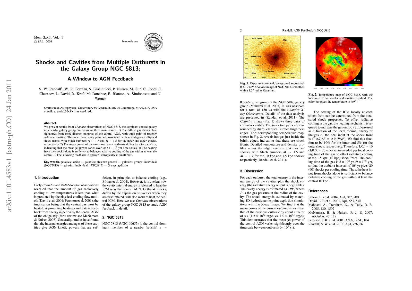 We present results from Chandra observations of NGC 5813, the dominant central galaxy in a nearby galaxy group. We focus on three main results. 1) The diffuse gas shows clear signatures from three distinct outbursts of the central AGN, with three pairs of roughly collinear cavities. The inner two cavity pairs are associated with unambiguous elliptical shock fronts, with Mach numbers M~1.7 and M~1.5 for the inner and outer shocks, respectively. 2) The mean power of the two most recent outbursts differs by a factor of six, indicating that the mean jet power varies over long (~10^7 yr) time scales. 3) The heating from the shocks alone is sufficient to balance radiative cooling of the gas within at least the central 10 kpc, allowing feedback to operate isotropically at small radii.