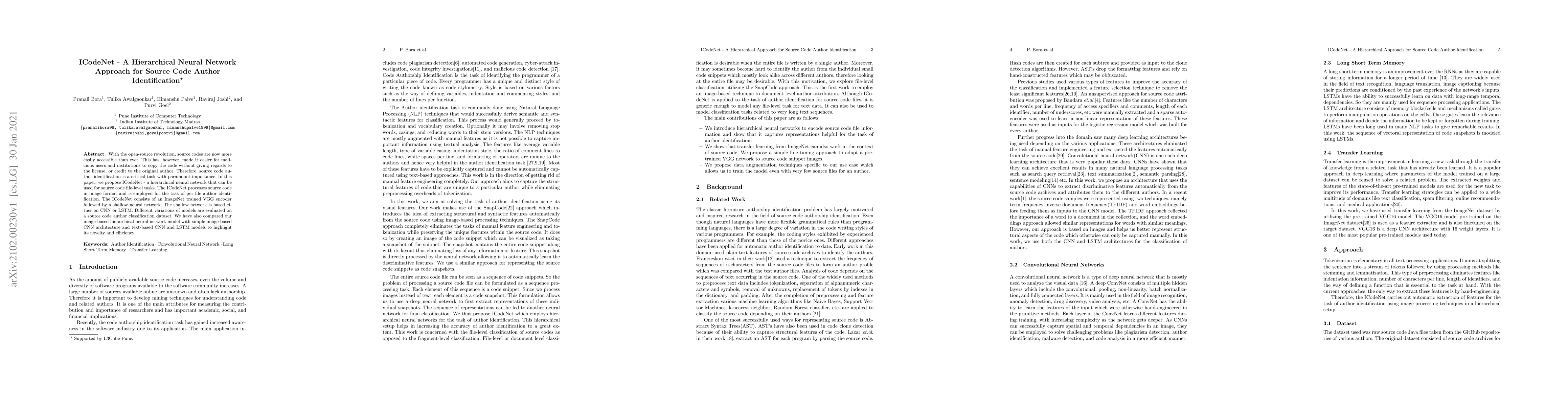 ICodeNet is a hierarchical neural network designed to identify the authors of source code files by processing them in image format. It combines an ImageNet-trained VGG encoder with a shallow neural network based on CNN or LSTM, demonstrating superior performance compared to traditional image-based and text-based models.