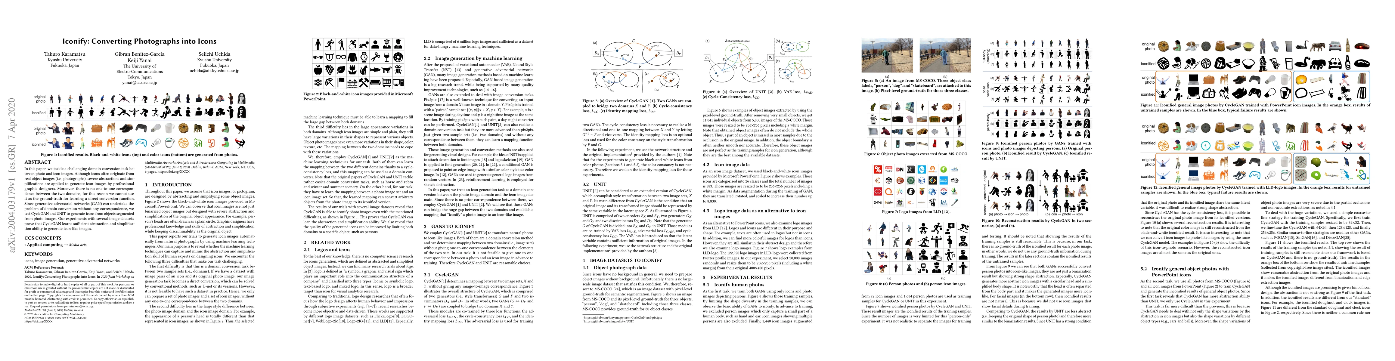 This paper explores the use of generative adversarial networks (GANs) to convert photographs into icons, employing CycleGAN and UNIT to achieve domain conversion without a one-to-one correspondence. Experiments demonstrate that CycleGAN effectively abstracts and simplifies photo images to generate icon-like outputs.