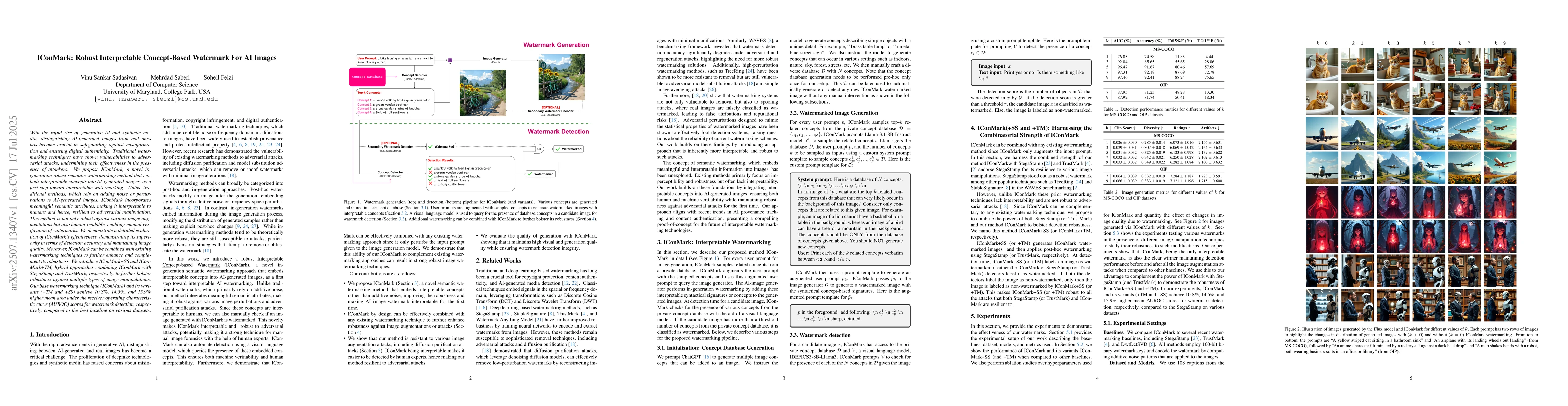 With the rapid rise of generative AI and synthetic media, distinguishing AI-generated images from real ones has become crucial in safeguarding against misinformation and ensuring digital authenticity. Traditional watermarking techniques have shown vulnerabilities to adversarial attacks, undermining their effectiveness in the presence of attackers. We propose IConMark, a novel in-generation robust semantic watermarking method that embeds interpretable concepts into AI-generated images, as a first step toward interpretable watermarking. Unlike traditional methods, which rely on adding noise or perturbations to AI-generated images, IConMark incorporates meaningful semantic attributes, making it interpretable to humans and hence, resilient to adversarial manipulation. This method is not only robust against various image augmentations but also human-readable, enabling manual verification of watermarks. We demonstrate a detailed evaluation of IConMark's effectiveness, demonstrating its superiority in terms of detection accuracy and maintaining image quality. Moreover, IConMark can be combined with existing watermarking techniques to further enhance and complement its robustness. We introduce IConMark+SS and IConMark+TM, hybrid approaches combining IConMark with StegaStamp and TrustMark, respectively, to further bolster robustness against multiple types of image manipulations. Our base watermarking technique (IConMark) and its variants (+TM and +SS) achieve 10.8%, 14.5%, and 15.9% higher mean area under the receiver operating characteristic curve (AUROC) scores for watermark detection, respectively, compared to the best baseline on various datasets.