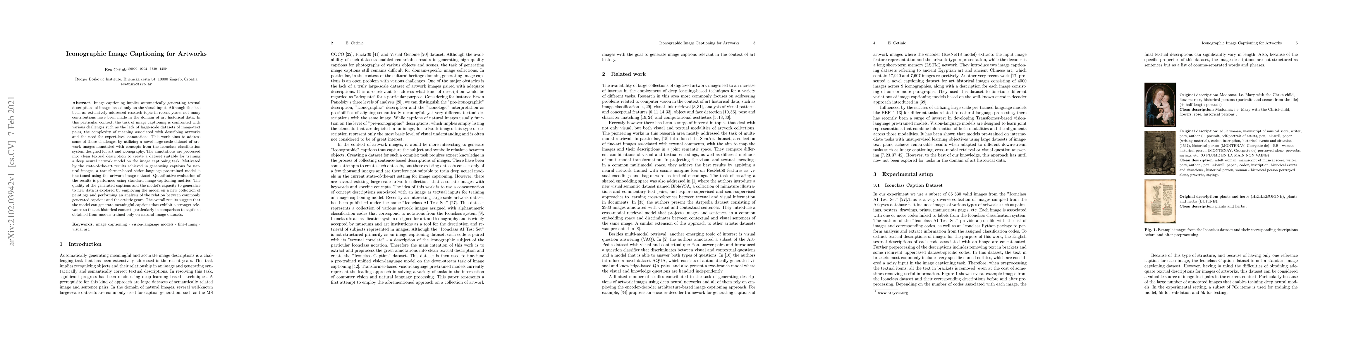 This paper develops a novel dataset of artwork images annotated with concepts from the Iconclass system, aiming to address challenges in art historical image captioning. A transformer-based model is fine-tuned on this dataset to generate descriptive captions, showing improved relevance to art historical context compared to models trained on natural images.
