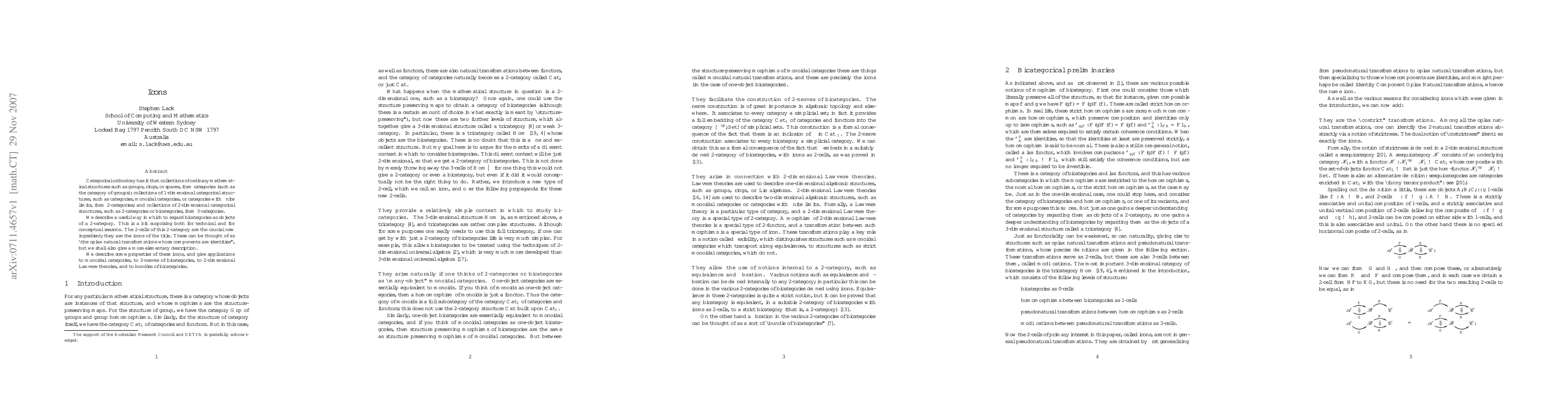 Categorical orthodoxy has it that collections of ordinary mathematical structures such as groups, rings, or spaces, form categories (such as the category of groups); collections of 1-dimensional categorical structures, such as categories, monoidal categories, or categories with finite limits, form 2-categories; and collections of 2-dimensional categorical structures, such as 2-categories or bicategories, form 3-categories. We describe a useful way in which to regard bicategories as objects of a 2-category. This is a bit surprising both for technical and for conceptual reasons. The 2-cells of this 2-category are the crucial new ingredient; they are the icons of the title. These can be thought of as ``the oplax natural transformations whose components are identities'', but we shall also give a more elementary description. We describe some properties of these icons, and give applications to monoidal categories, to 2-nerves of bicategories, to 2-dimensional Lawvere theories, and to bundles of bicategories.