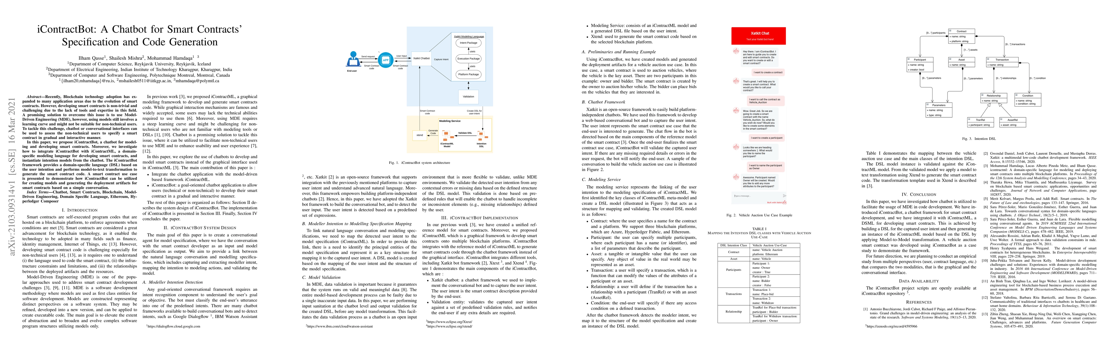 This paper proposes iContractBot, a chatbot that helps non-technical users specify and generate smart contract code through interactive conversations.