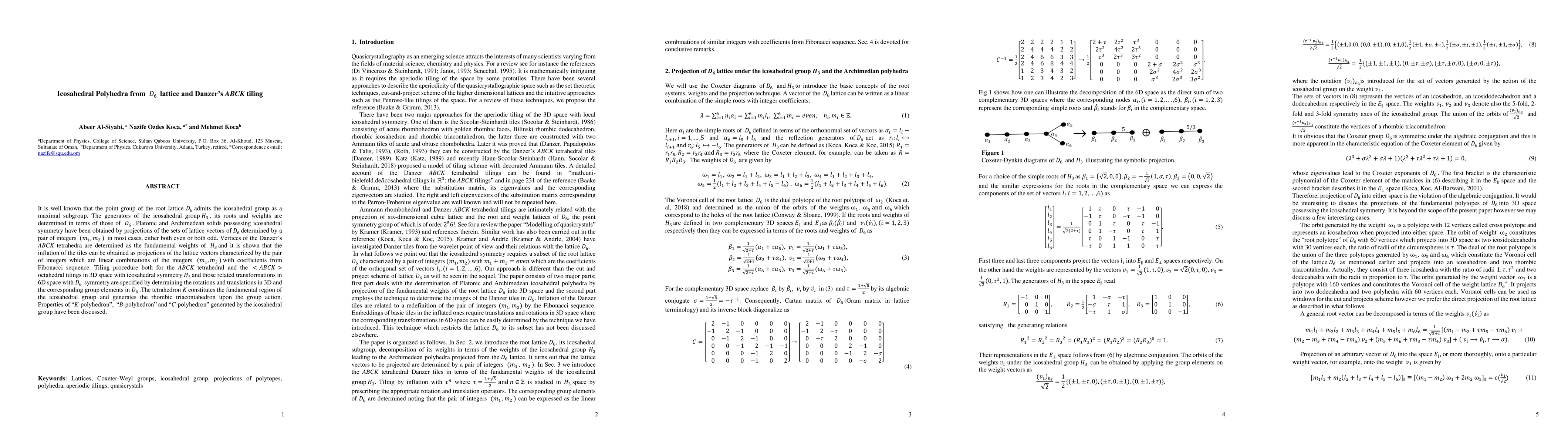 This paper explores the relationship between the D6 lattice and the icosahedral group, deriving icosahedral symmetry from the D6 root lattice. It details the generation of Platonic and Archimedean solids via lattice vector projections and examines Danzer's ABCK tiling, showing how its inflation relates to Fibonacci sequences and group actions in 3D.