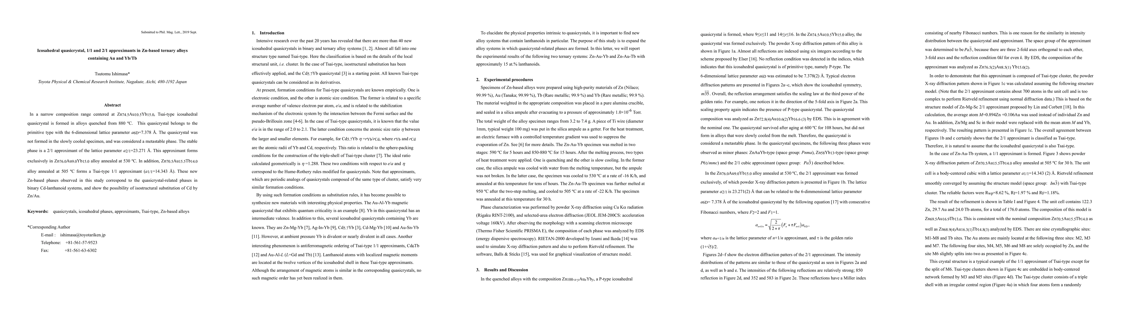 In a narrow composition range centered at Zn74.5Au10.5Yb15.0, Tsai-type icosahedral quasicrystal is formed in alloys quenched from 880 C. This quasicrystal belongs to the primitive type with the 6-dimensional lattice parameter a6D=7.378 A. The quasicrystal was not formed in the slowly cooled specimen, and was considered a metastable phase. The stable phase is a 2/1 approximant of the lattice parameter a2/1=23.271 A. This approximant forms exclusively in Zn76.0Au9.0Yb15.0 alloy annealed at 530 C. In addition, Zn70.5Au15.5Tb14.0 alloy annealed at 505 C forms a Tsai-type 1/1 approximant (a1/1=14.343 A). These new Zn-based phases observed in this study correspond to the quasicrystal-related phases in binary Cd-lanthanoid systems, and show the possibility of isostructural substitution of Cd by Zn/Au.
