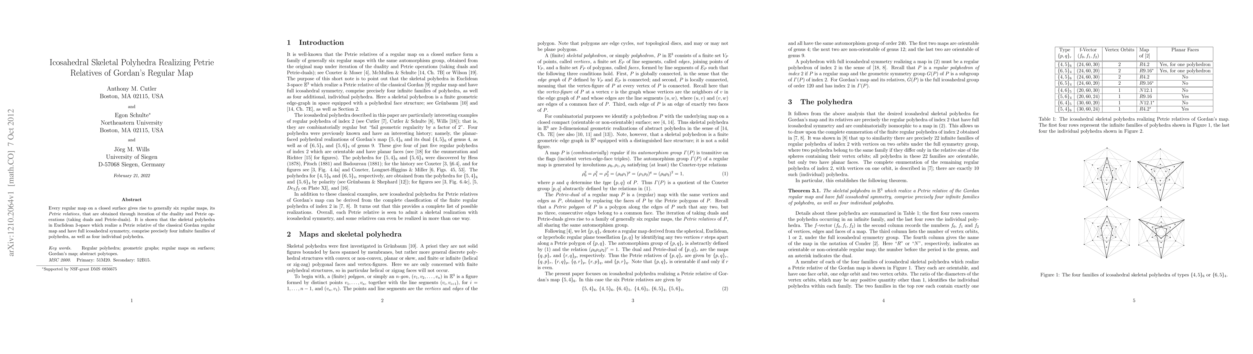 This paper explores skeletal polyhedra in Euclidean 3-space that realize Petrie relatives of Gordan's regular map, revealing that these polyhedra exhibit full icosahedral symmetry and are categorized into four infinite families and four individual instances.