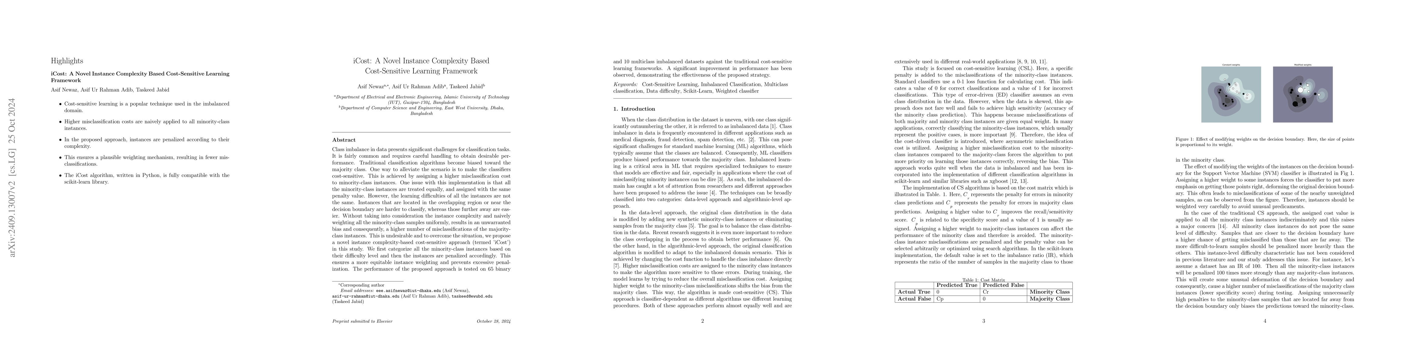 The paper introduces iCost, a novel cost-sensitive learning framework for imbalanced classification that categorizes minority-class instances by complexity, assigning different misclassification costs based on their proximity to the decision boundary. The proposed method significantly improves classification performance compared to traditional cost-sensitive approaches, as validated on 66 imbalanced datasets.