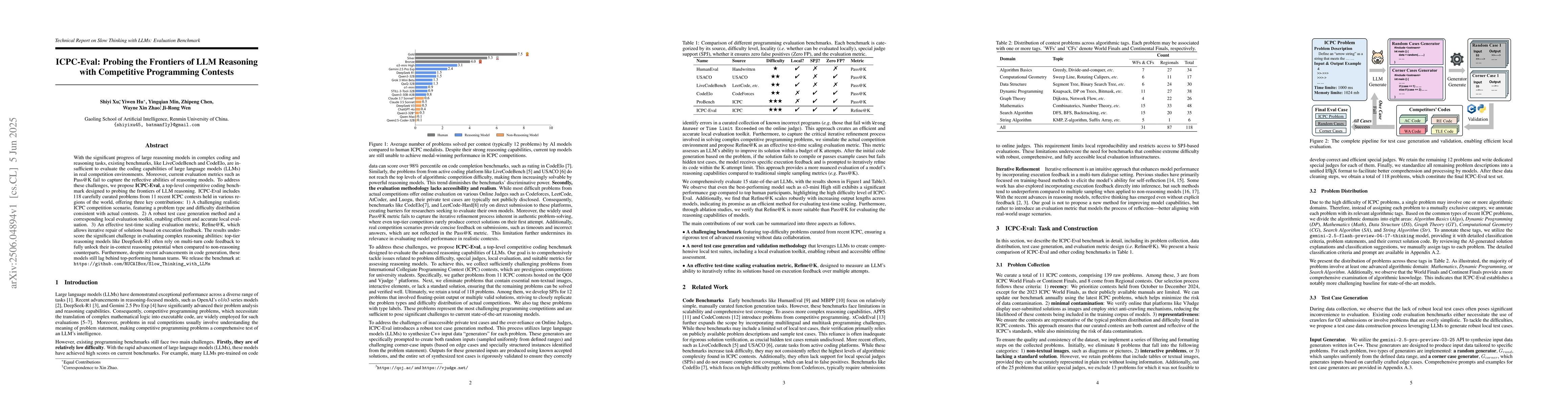 ICPC-Eval, a competitive coding benchmark with a robust test case generation method and Refine@K evaluation metric.