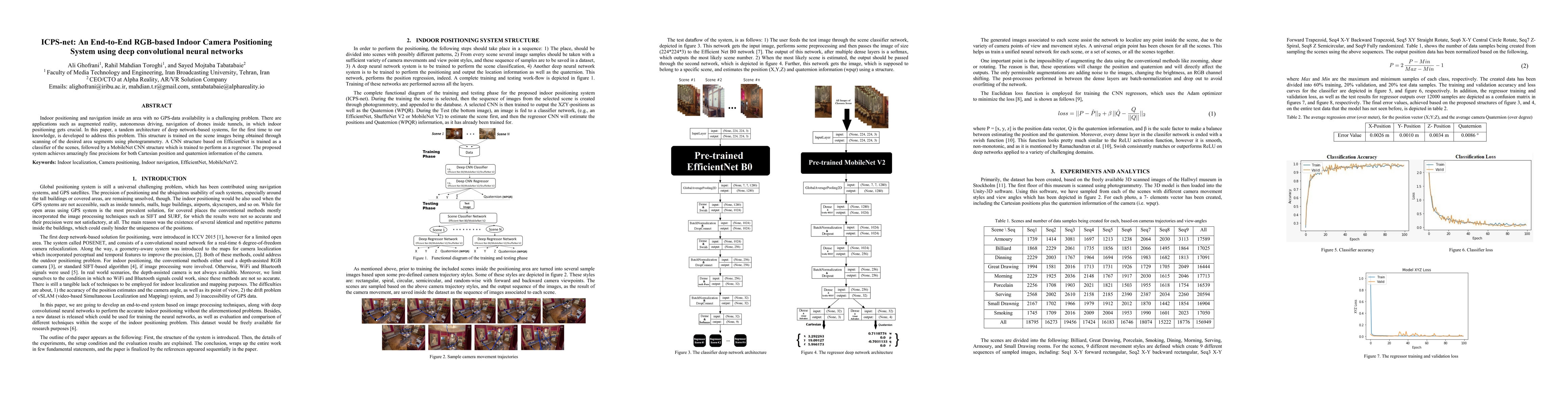 Indoor positioning and navigation inside an area with no GPS-data availability is a challenging problem. There are applications such as augmented reality, autonomous driving, navigation of drones inside tunnels, in which indoor positioning gets crucial. In this paper, a tandem architecture of deep network-based systems, for the first time to our knowledge, is developed to address this problem. This structure is trained on the scene images being obtained through scanning of the desired area segments using photogrammetry. A CNN structure based on EfficientNet is trained as a classifier of the scenes, followed by a MobileNet CNN structure which is trained to perform as a regressor. The proposed system achieves amazingly fine precisions for both Cartesian position and Quaternion information of the camera.