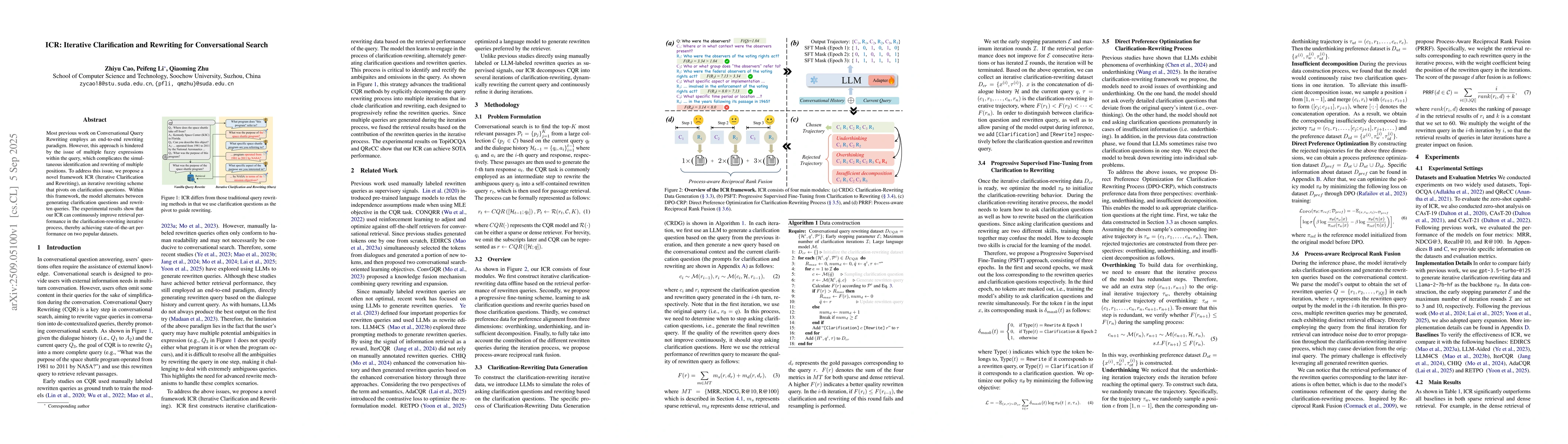 Most previous work on Conversational Query Rewriting employs an end-to-end rewriting paradigm. However, this approach is hindered by the issue of multiple fuzzy expressions within the query, which complicates the simultaneous identification and rewriting of multiple positions. To address this issue, we propose a novel framework ICR (Iterative Clarification and Rewriting), an iterative rewriting scheme that pivots on clarification questions. Within this framework, the model alternates between generating clarification questions and rewritten queries. The experimental results show that our ICR can continuously improve retrieval performance in the clarification-rewriting iterative process, thereby achieving state-of-the-art performance on two popular datasets.