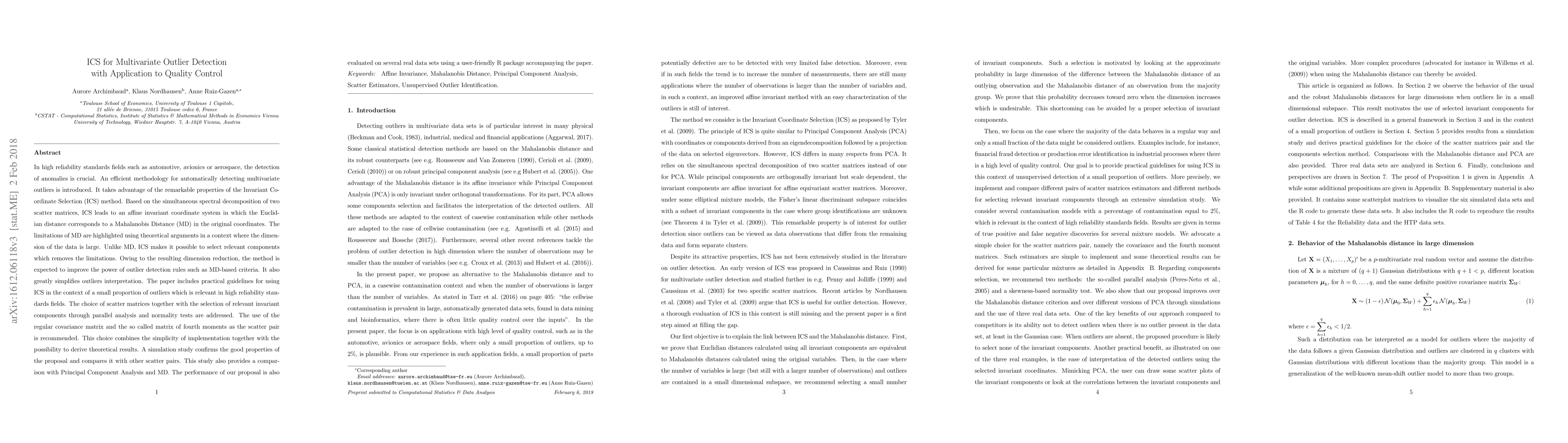This research introduces Invariant Coordinate Selection (ICS) for detecting multivariate outliers in high-reliability fields, improving upon traditional Mahalanobis Distance methods with enhanced dimension reduction and outlier interpretation capabilities.