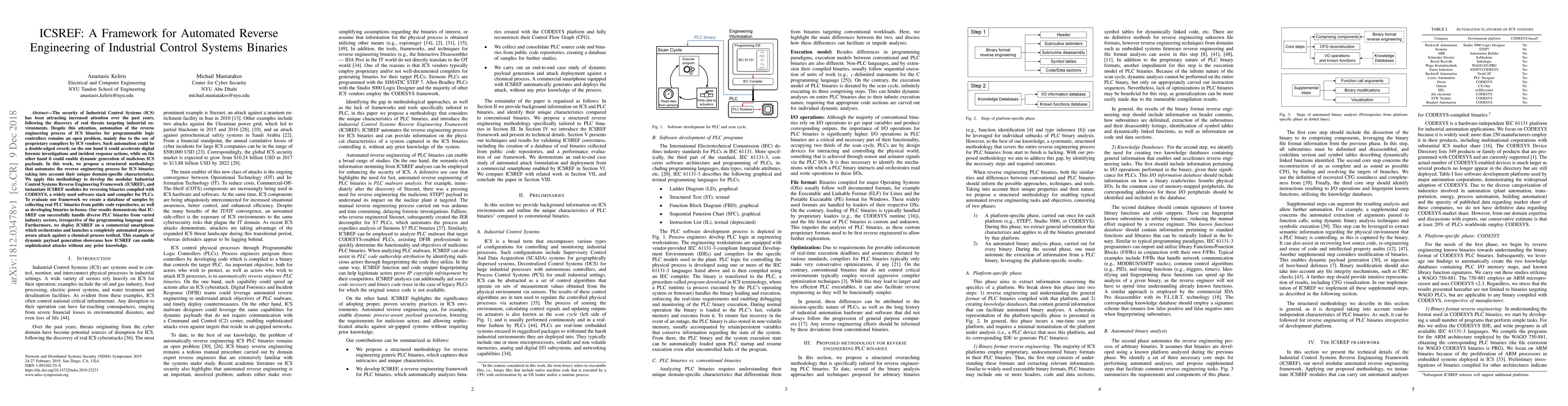 The ICSREF framework automates the reverse engineering of Industrial Control Systems (ICS) binaries, addressing the challenge of proprietary compilers. It successfully handles diverse PLC binaries and demonstrates potential for both forensic investigations and malicious payload generation through a real-world attack on a chemical process testbed.