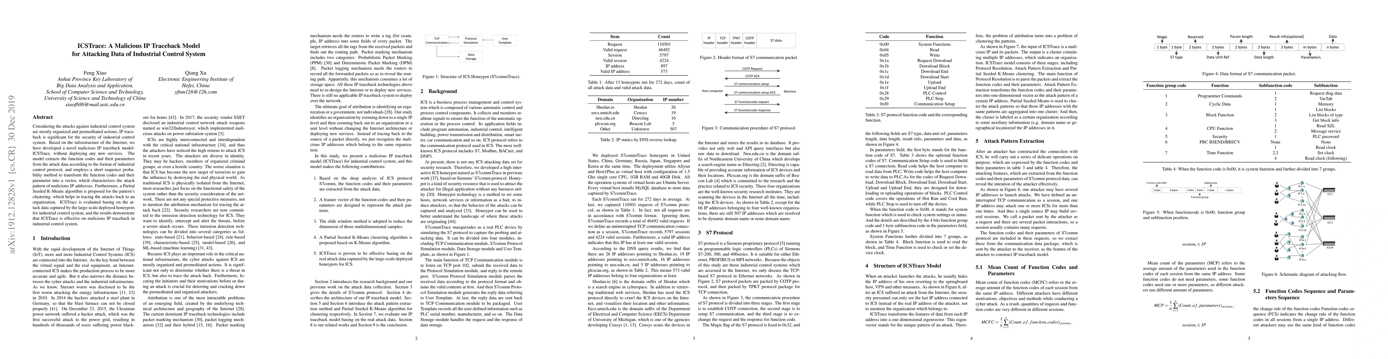 ICSTrace is a novel IP traceback model for industrial control systems that uses function code extraction and a short sequence probability method to characterize attack patterns. It employs a Partial Seeded K-Means algorithm for clustering, demonstrating effectiveness in tracing malicious IP addresses based on large-scale honeypot data.