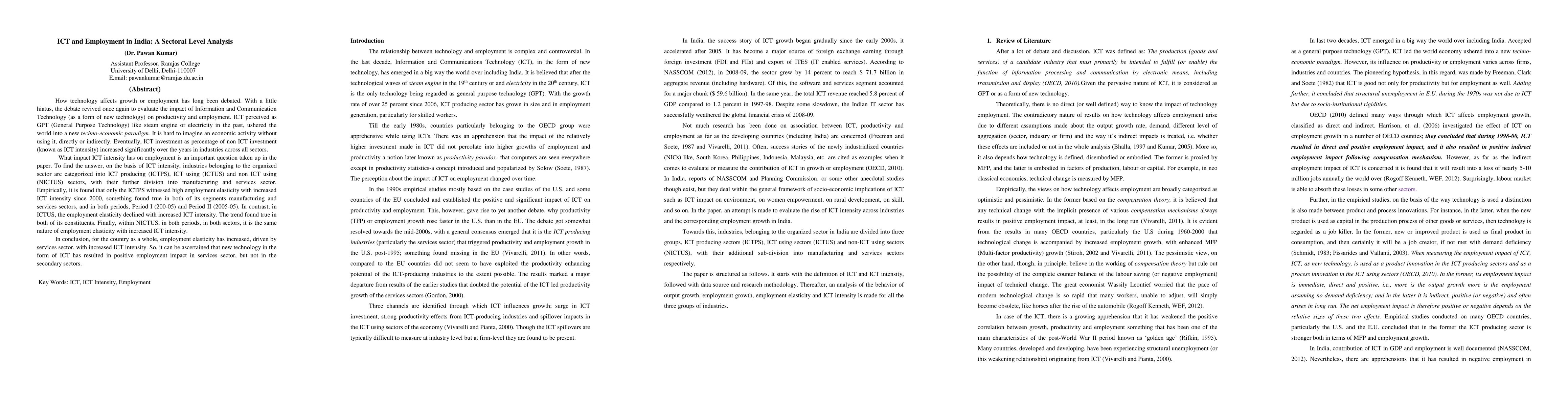 How technology affects growth or employment has long been debated. With a hiatus, the debate revived once again in the form of how Information and Communications Technology, as a form of new technology, exerts on productivity and employment. Information and Communications Technology perceived as General Purpose Technology like steam engine or electricity in the past, ushered the world into a new techno-economic paradigm, given its deep social, economic and cultural implications. For instance, within economic implication, it is hard to imagine an economic activity that does not it, directly or indirectly. Eventually, Information and Communications Technology intensity, measure as the ratio of Information and Communications Technology investment to total investment, increased phenomenally in industries across sectors.