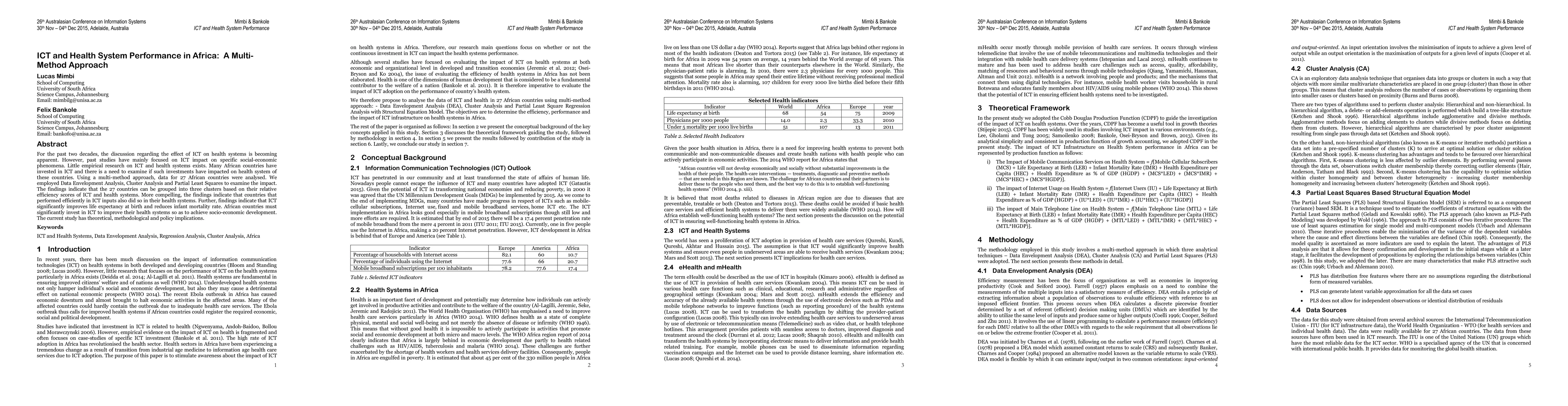 This study employs a multi-method approach to analyze the impact of ICT investments on health systems in 27 African countries, finding that efficient ICT inputs correlate with better health system performance. The research concludes that ICT significantly enhances life expectancy and reduces infant mortality, advocating for substantial ICT investment to boost health systems and socio-economic development.