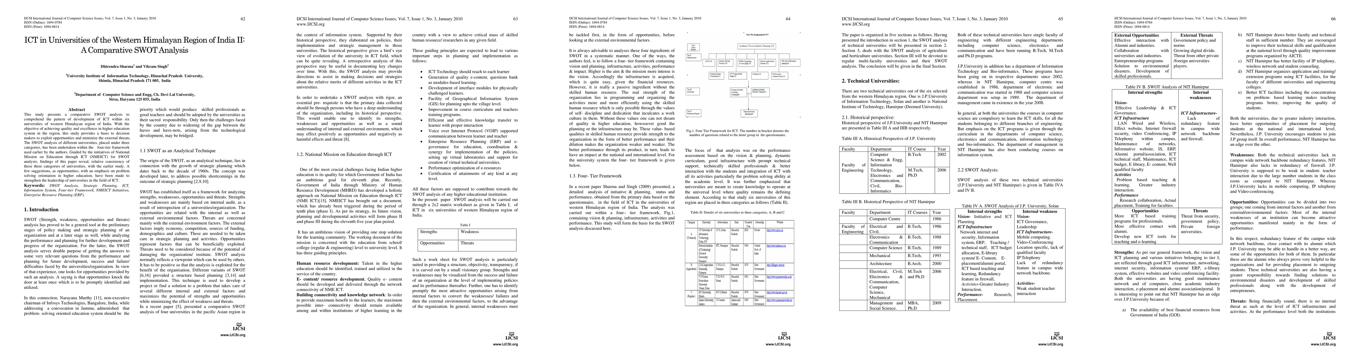 A SWOT analysis was conducted to identify the strengths, weaknesses, opportunities, and threats of various higher educational institutions in the Western Himalayan region of India.