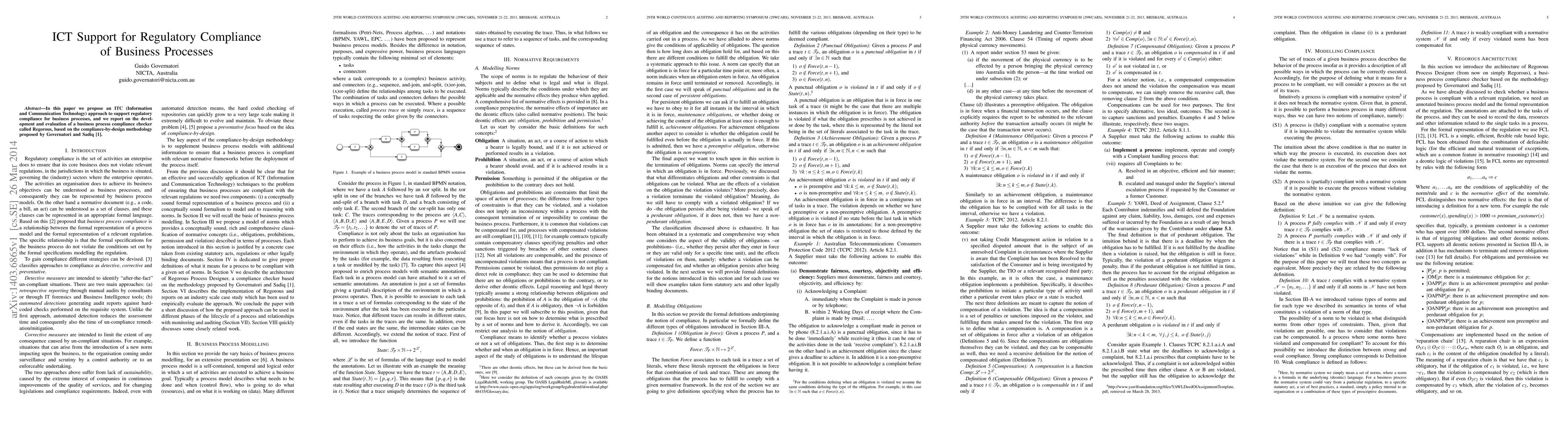This paper introduces an ICT-based approach to ensure regulatory compliance in business processes, presenting the development and evaluation of Regorous, a compliance checker tool grounded in the compliance-by-design methodology by Governatori and Sadiq.