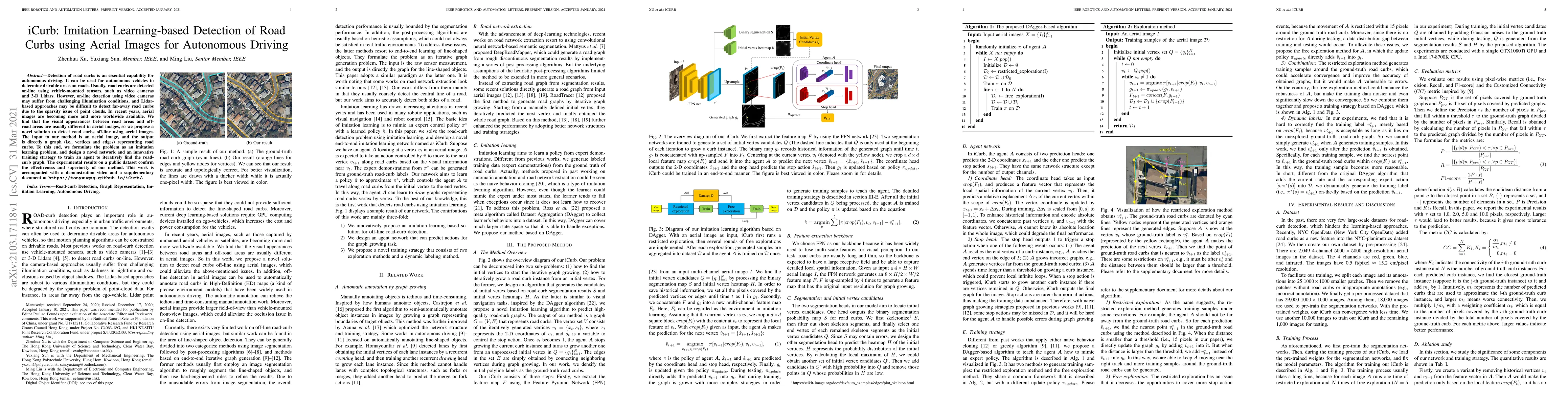 The paper proposes iCurb, an imitation learning-based method for detecting road curbs using aerial images to enhance autonomous driving. The method leverages visual differences in aerial images to detect curbs off-line, offering a robust alternative to on-line detection methods that struggle with illumination and sparsity issues.