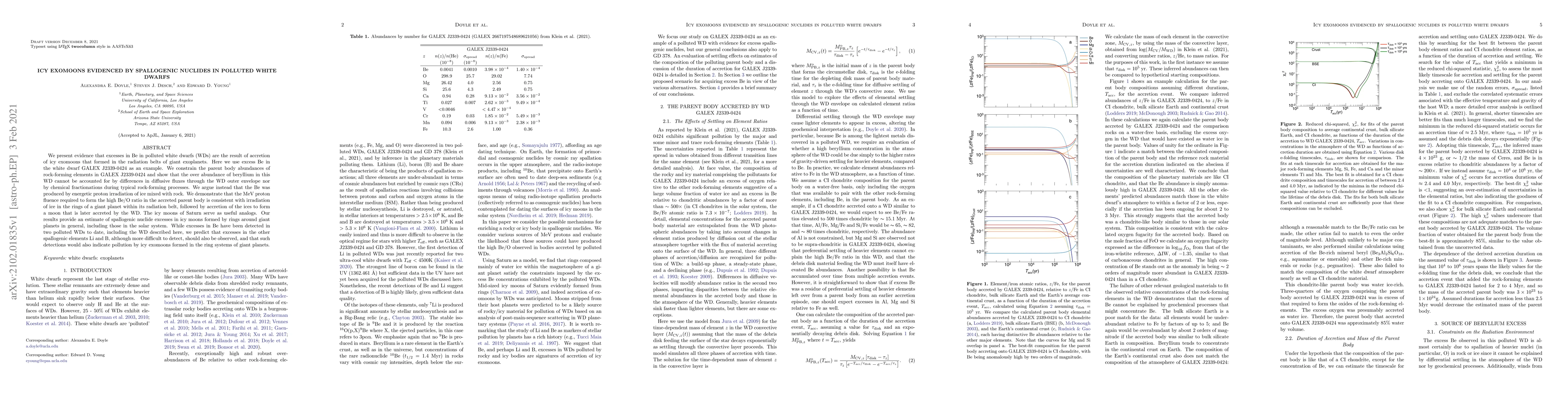 We present evidence that excesses in Be in polluted white dwarfs (WDs) are the result of accretion of icy exomoons that formed in the radiation belts of giant exoplanets. Here we use excess Be in the white dwarf GALEX J2339-0424 as an example. We constrain the parent body abundances of rock-forming elements in GALEX J2339-0424 and show that the overabundance of beryllium in this WD cannot be accounted for by differences in diffusive fluxes through the WD outer envelope nor by chemical fractionations during typical rock-forming processes. We argue instead that the Be was produced by energetic proton irradiation of ice mixed with rock. We demonstrate that the MeV proton fluence required to form the high Be/O ratio in the accreted parent body is consistent with irradiation of ice in the rings of a giant planet within its radiation belt, followed by accretion of the ices to form a moon that is later accreted by the WD. The icy moons of Saturn serve as useful analogs. Our results provide an estimate of spallogenic nuclide excesses in icy moons formed by rings around giant planets in general, including those in the solar system. While excesses in Be have been detected in two polluted WDs to date, including the WD described here, we predict that excesses in the other spallogenic elements Li and B, although more difficult to detect, should also be observed, and that such detections would also indicate pollution by icy exomoons formed in the ring systems of giant planets.