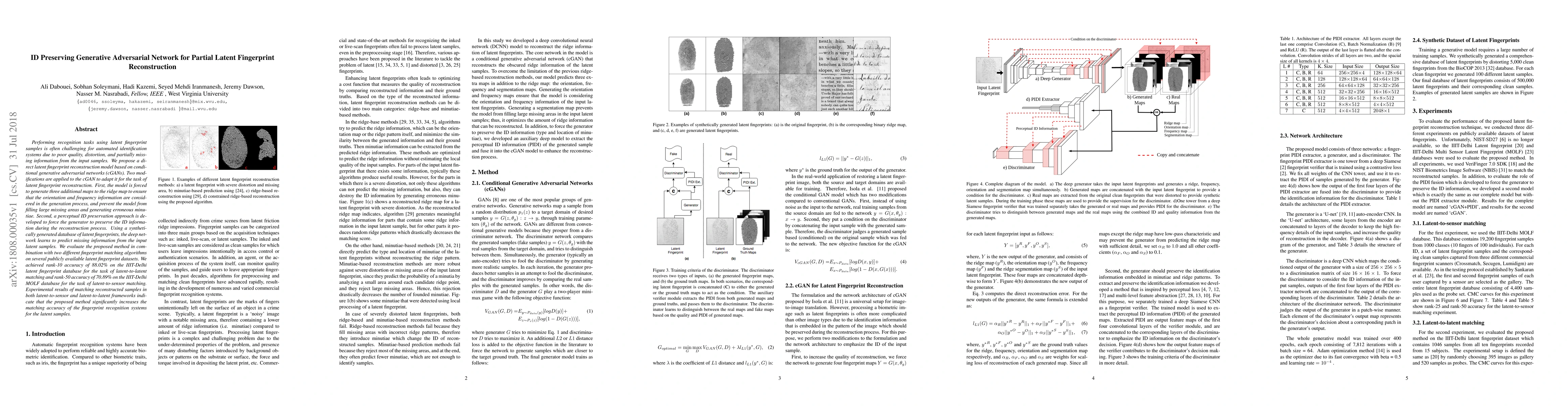 This paper proposes a conditional GAN model for reconstructing partial latent fingerprints, incorporating additional maps to preserve orientation and frequency, and an ID preservation approach to maintain identity information. Experimental results show significant improvements in latent fingerprint recognition accuracy.