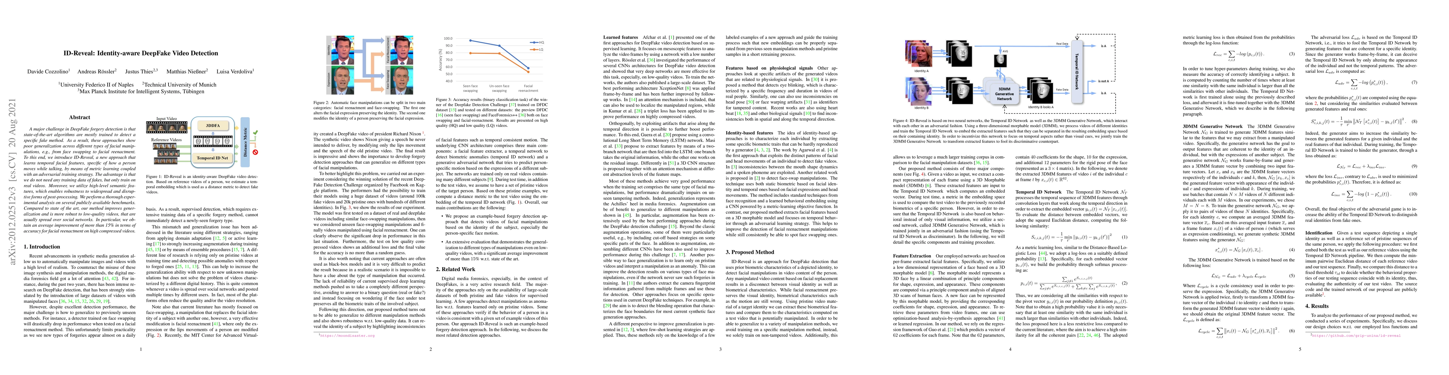 ID-Reveal is a novel DeepFake detection method that leverages temporal facial features and metric learning without the need for fake training data, achieving better generalization across various types of facial manipulations. It shows significant improvements in accuracy, especially for facial reenactment in low-quality videos, outperforming existing state-of-the-art techniques.