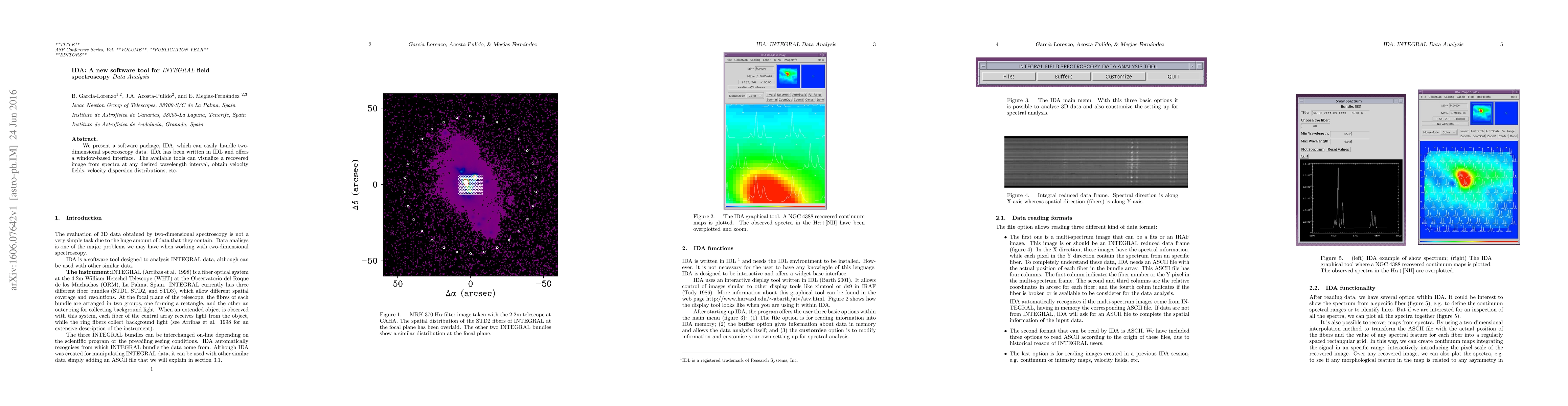 Summary: IDA is a new IDL-based software tool for analyzing INTEGRAL field spectroscopy data, featuring a user-friendly interface to visualize spectral images and derive velocity fields and dispersion distributions.