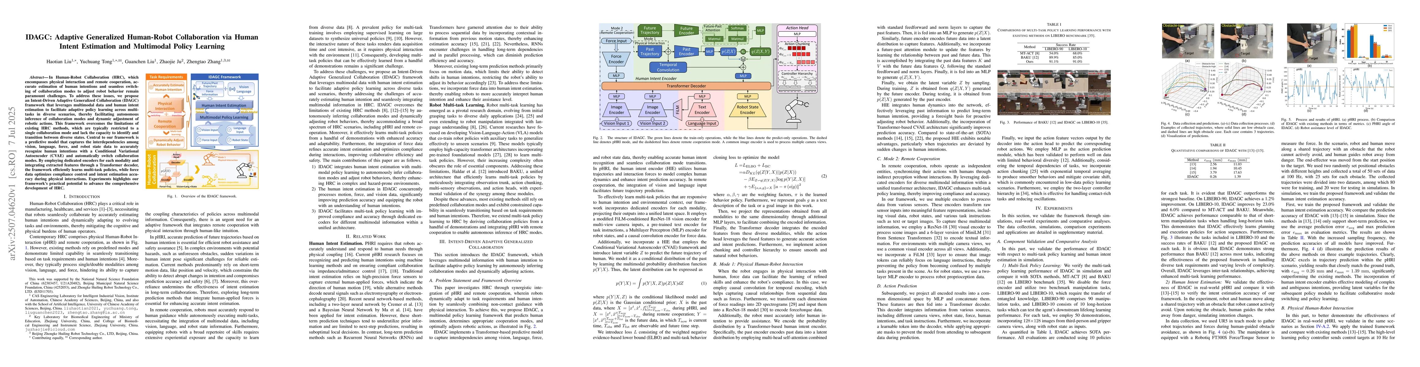 In Human-Robot Collaboration (HRC), which encompasses physical interaction and remote cooperation, accurate estimation of human intentions and seamless switching of collaboration modes to adjust robot behavior remain paramount challenges. To address these issues, we propose an Intent-Driven Adaptive Generalized Collaboration (IDAGC) framework that leverages multimodal data and human intent estimation to facilitate adaptive policy learning across multi-tasks in diverse scenarios, thereby facilitating autonomous inference of collaboration modes and dynamic adjustment of robotic actions. This framework overcomes the limitations of existing HRC methods, which are typically restricted to a single collaboration mode and lack the capacity to identify and transition between diverse states. Central to our framework is a predictive model that captures the interdependencies among vision, language, force, and robot state data to accurately recognize human intentions with a Conditional Variational Autoencoder (CVAE) and automatically switch collaboration modes. By employing dedicated encoders for each modality and integrating extracted features through a Transformer decoder, the framework efficiently learns multi-task policies, while force data optimizes compliance control and intent estimation accuracy during physical interactions. Experiments highlights our framework's practical potential to advance the comprehensive development of HRC.